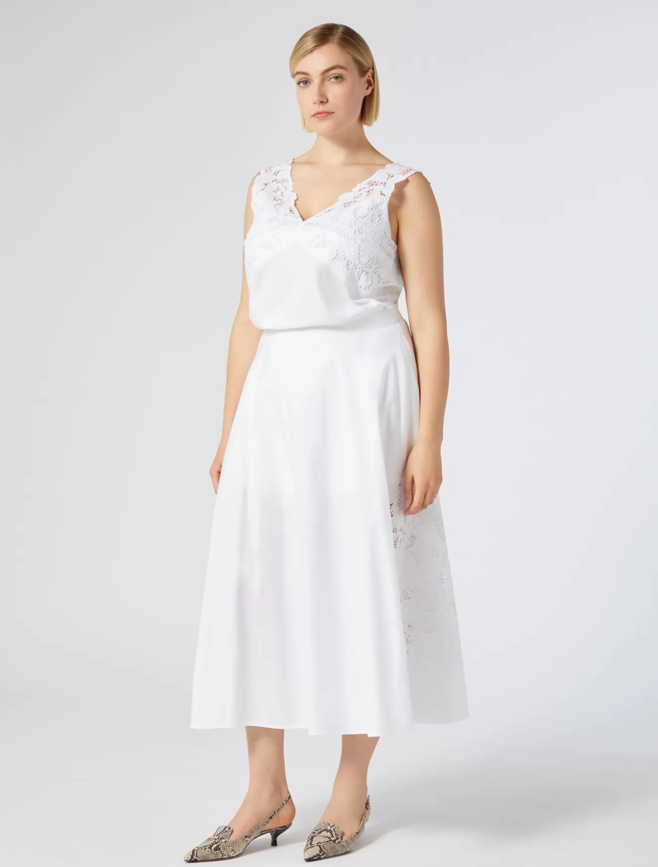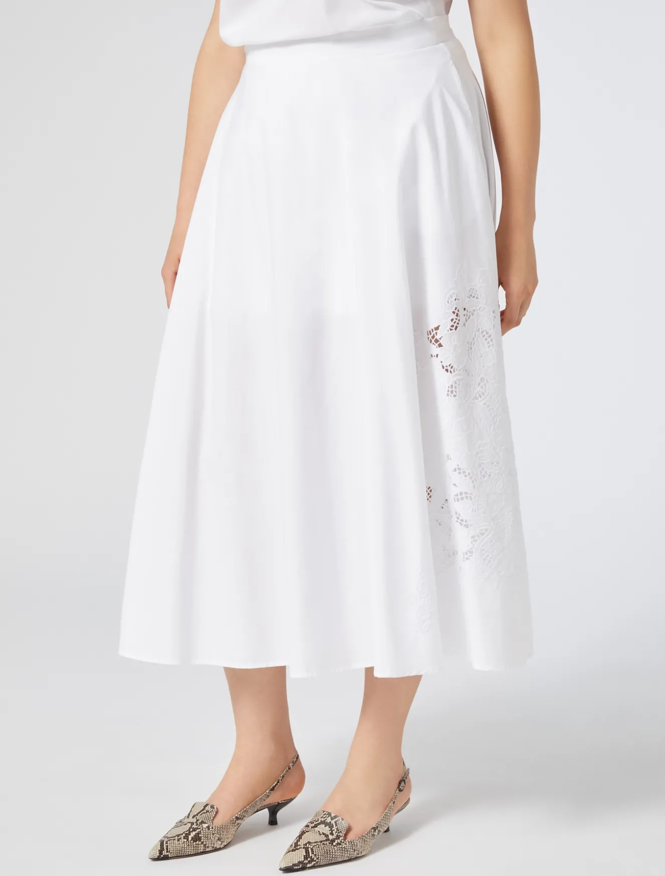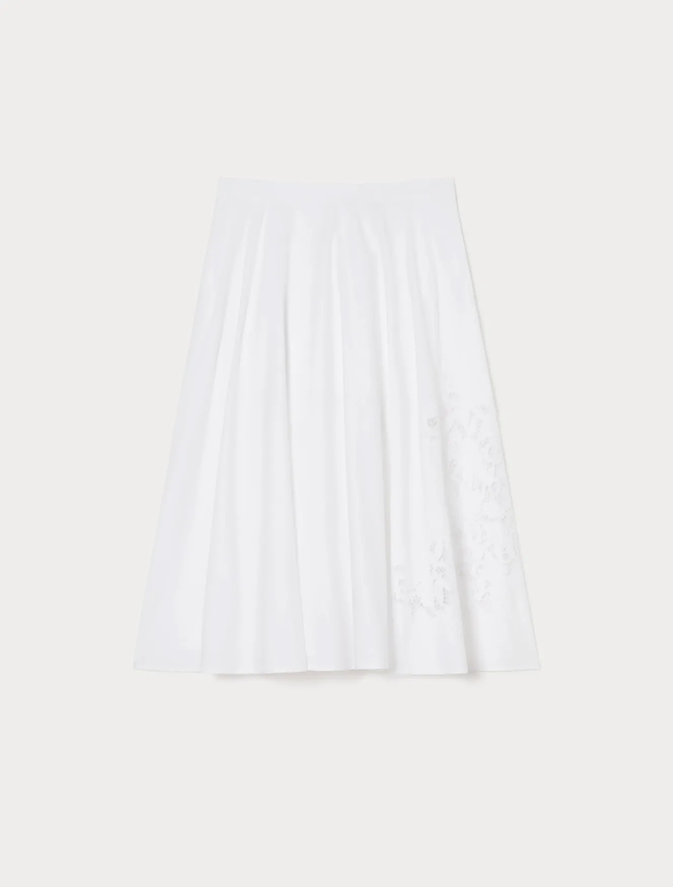 Fresca e femminile la gonna in popeline di puro cotone, impreziosita da un ricamo a intaglio in filo sul fianco. Ideale per elevare lo stile daily.