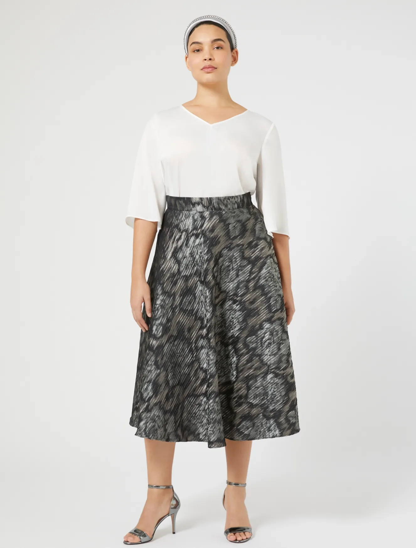 Stile senza tempo per la gonna in tessuto jacquard a disegno floreale con linea a ruota. La chiusura con zip su un fianco completa il capo. Il capo fa parte della collezione Persona by Marina Rinaldi.