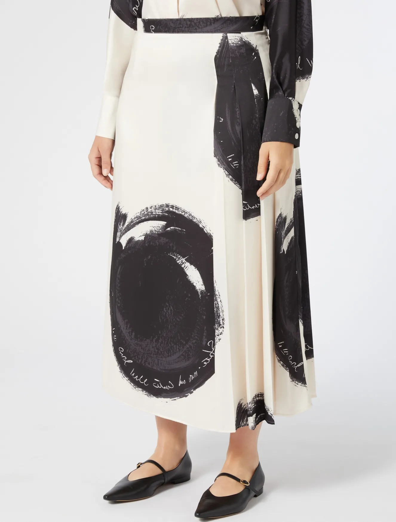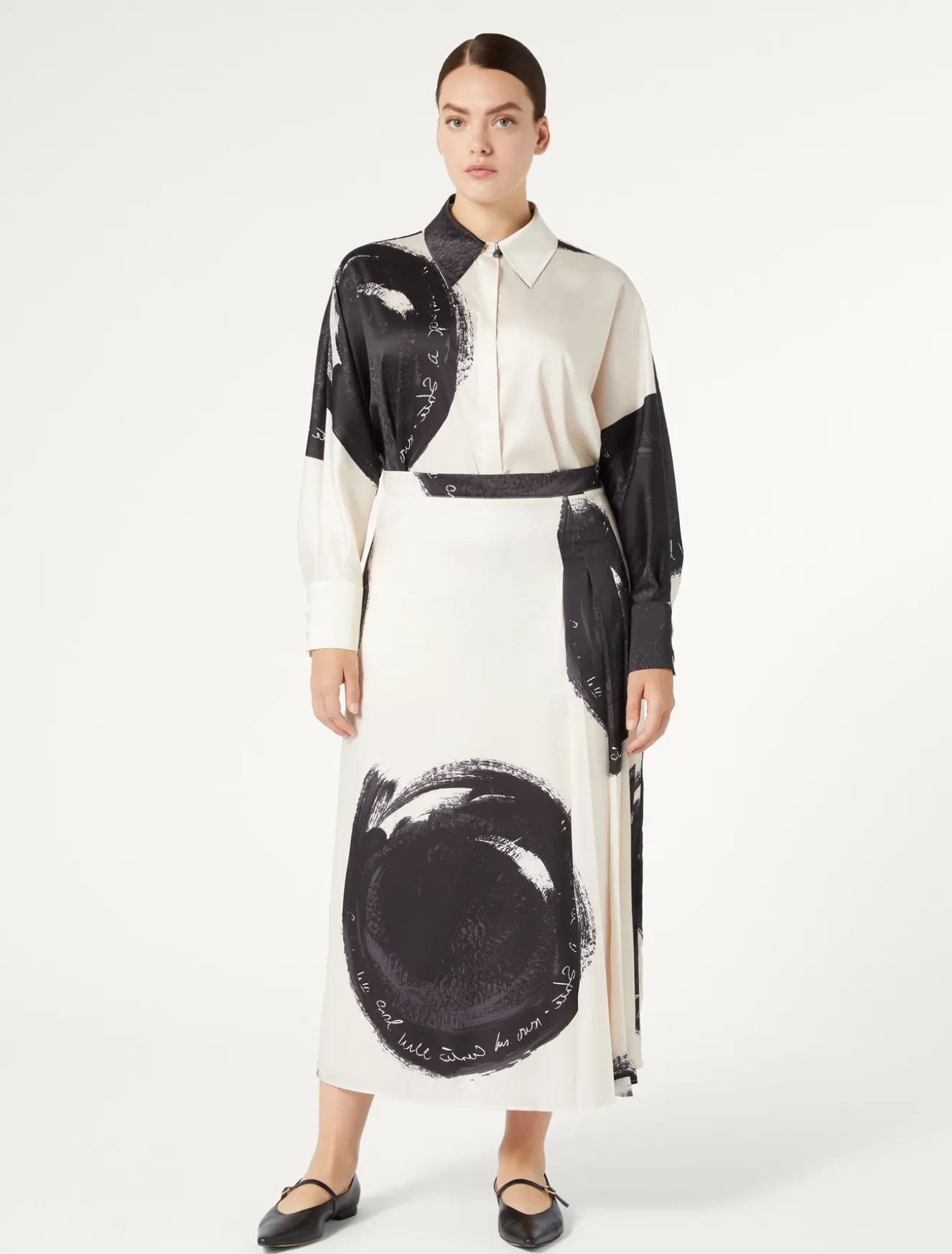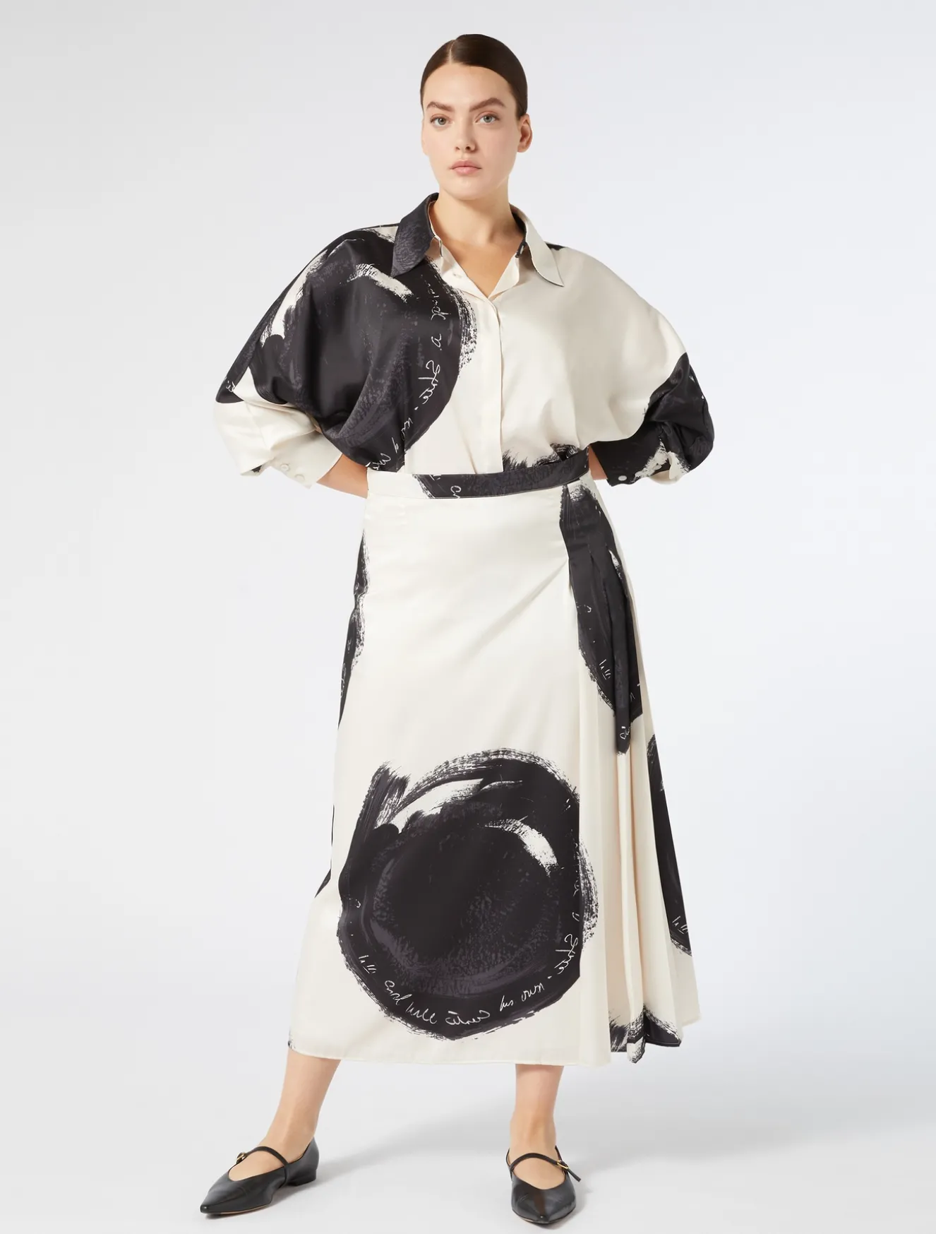 Pieghe asimmetriche per la gonna in twill di viscosa con stampa piazzata esclusiva a maxi pois. Design ricercato e attuale per completare lo stile dei look daily e speciali.Il capo fa parte della main collection Marina Rinaldi.