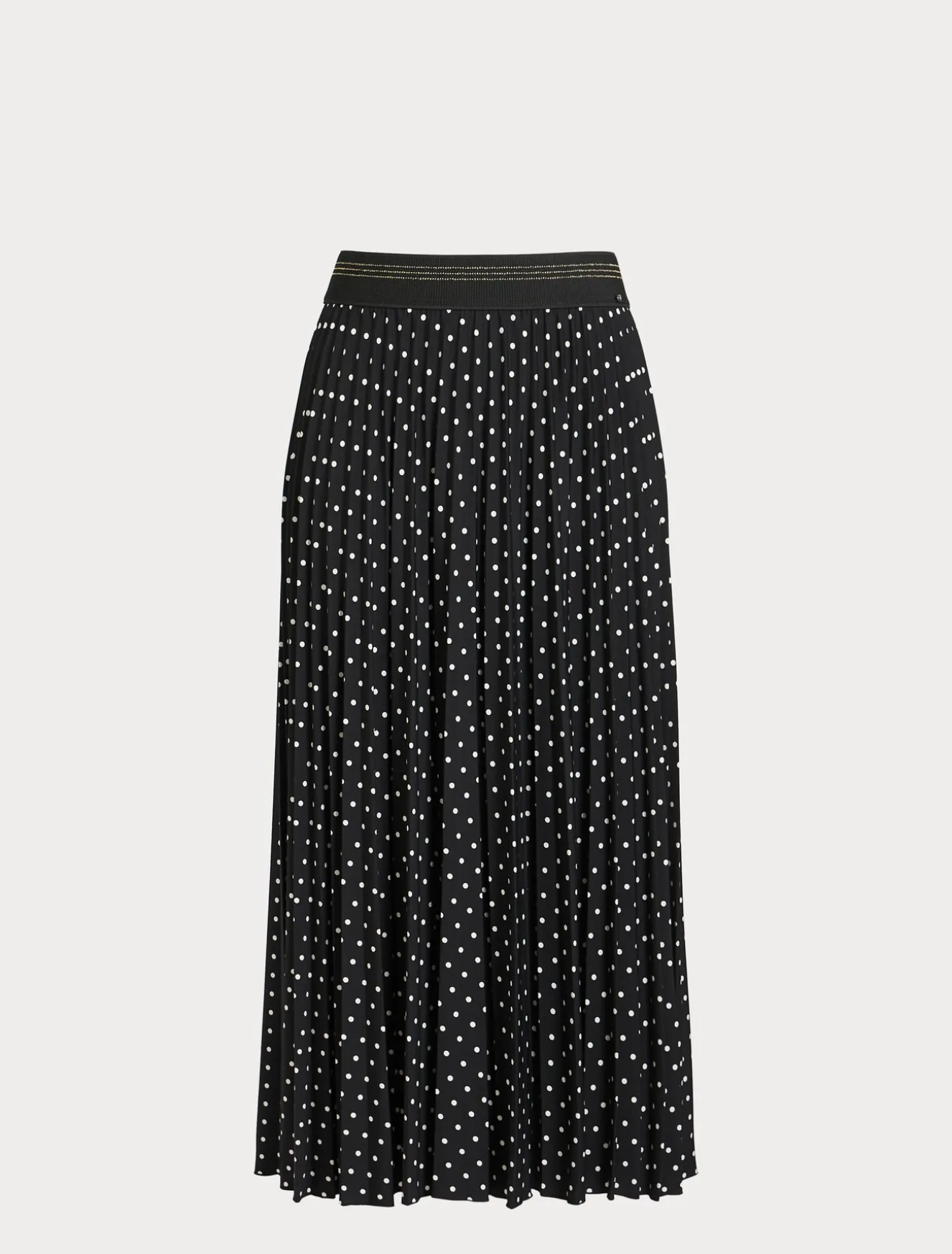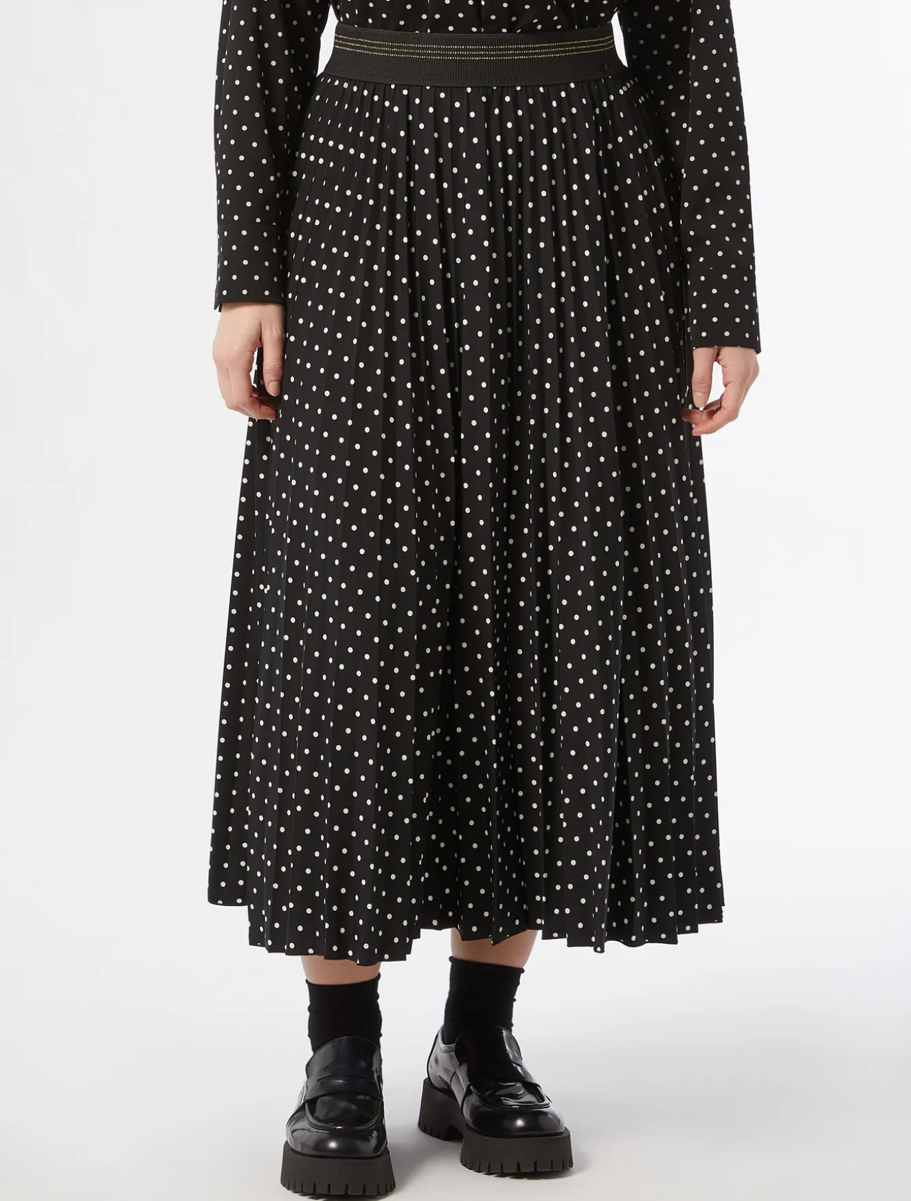 Attitudine femminile per la gonna lunga in jersey con lavorazione plissé e stampa a pois. Perfetta per dare movimento al tuo stile in un attimo.Il capo fa parte della collezione Marina Sport.