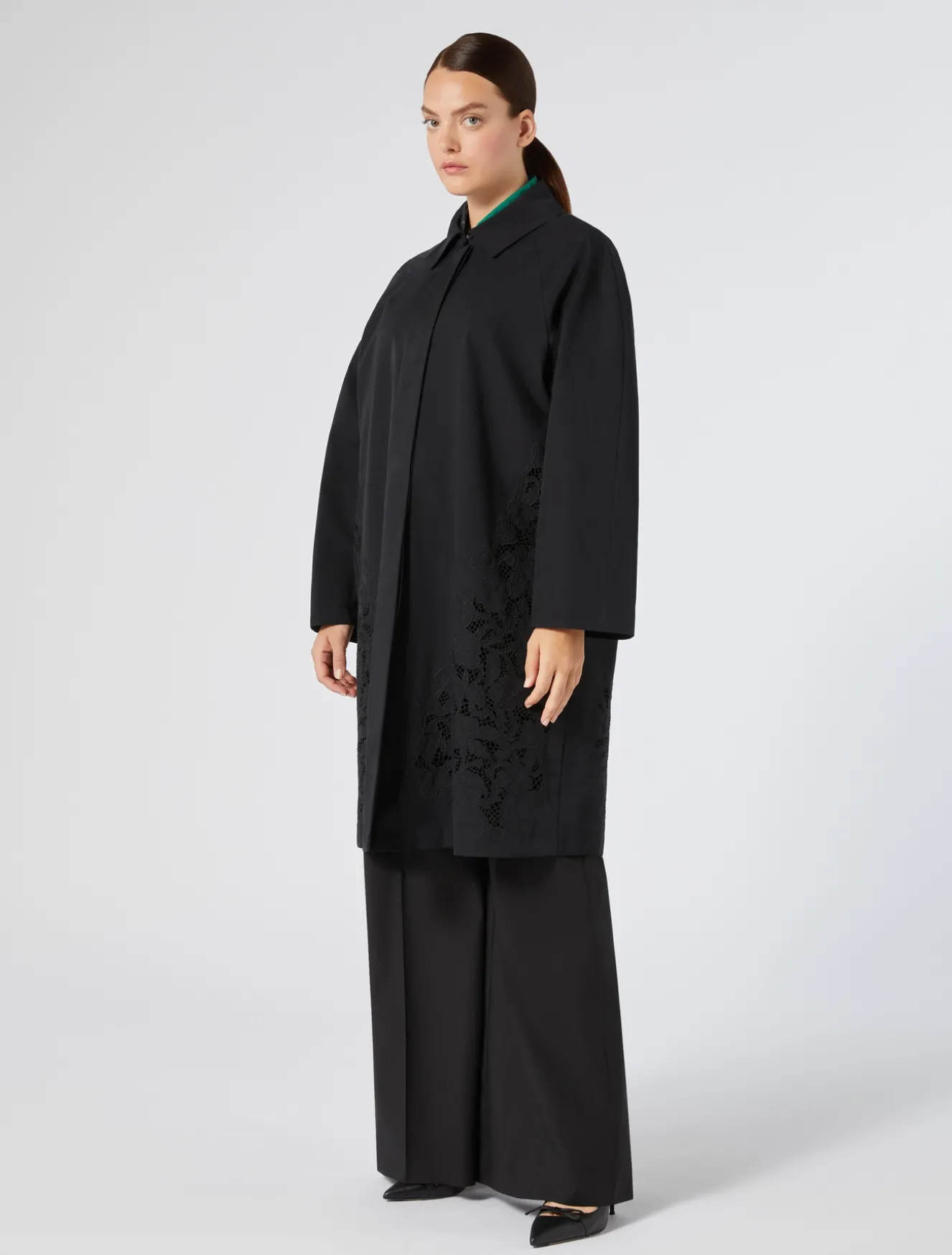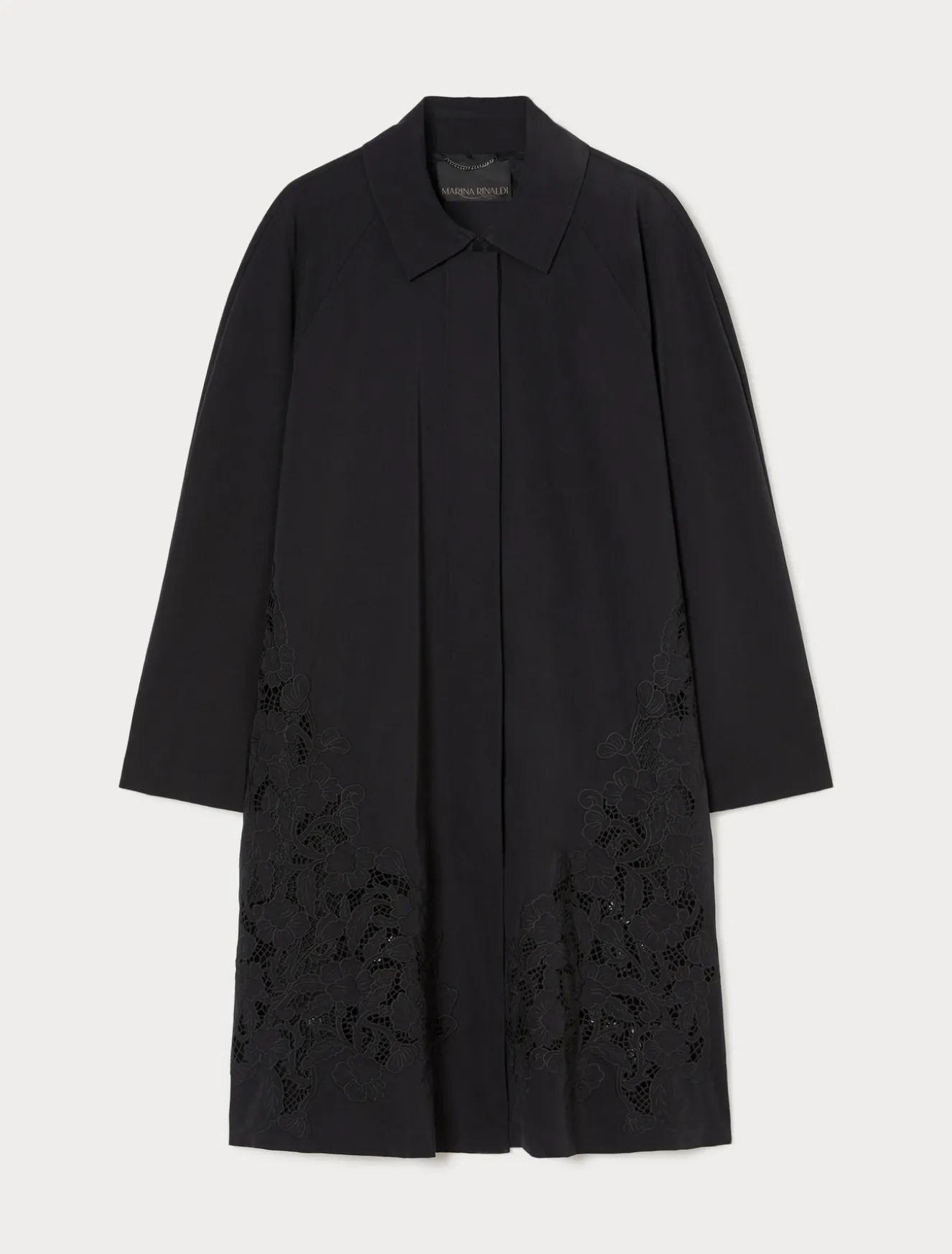 Prezioso ricamo in filo e intagliato per l’impermeabile in twill antigoccia, dalla linea leggermente svasata. Perfetto da sfoggiare in look day to night.