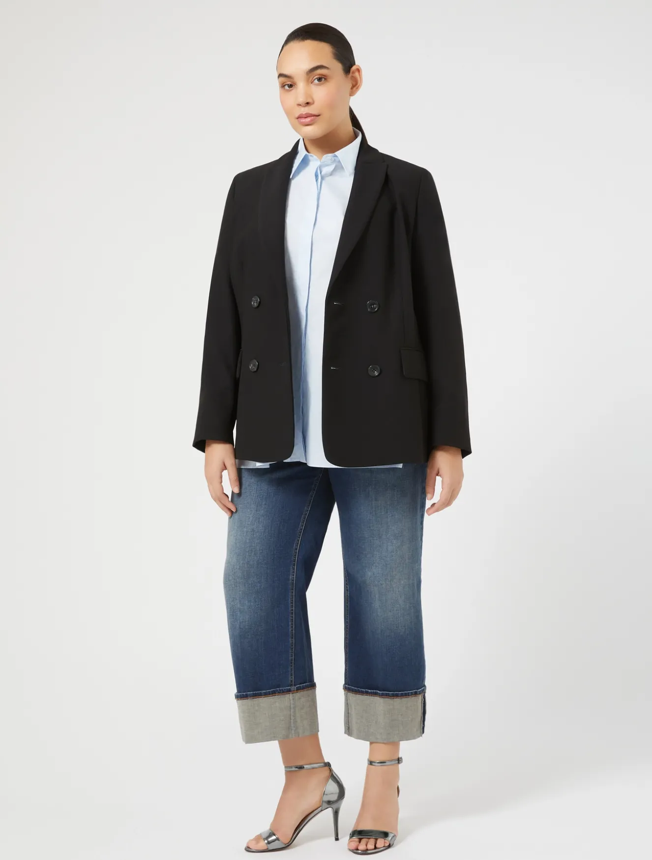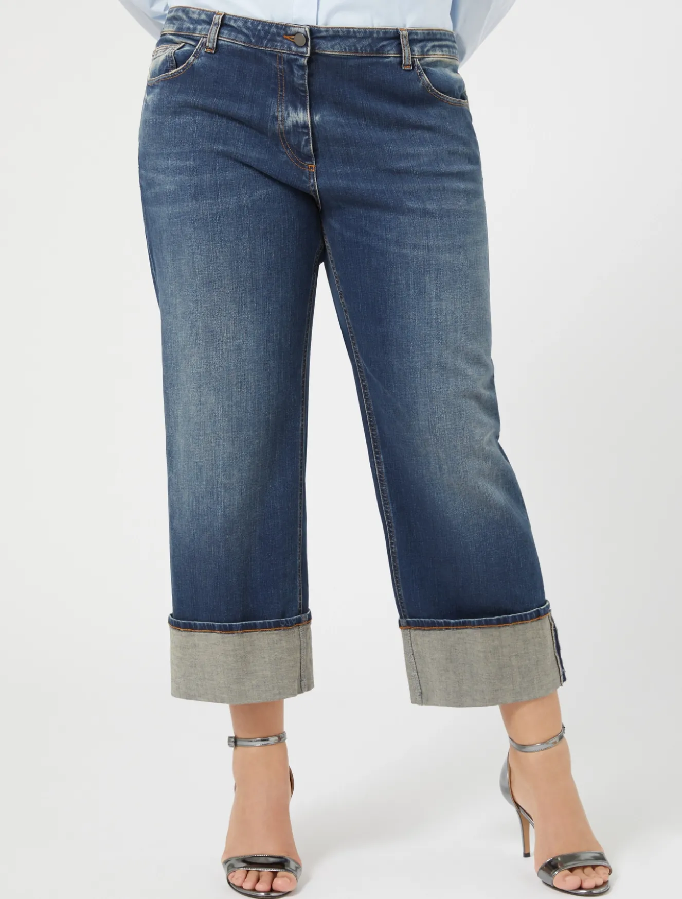 Dettagli di stile per i pantaloni in denim di cotone con design cinque tasche. Lavaggio stone wash. La piega stirata al centro e il maxi risvolto a fondo gamba donano un tocco contemporaneo.Il capo fa parte della collezione Persona by Marina Rinaldi.