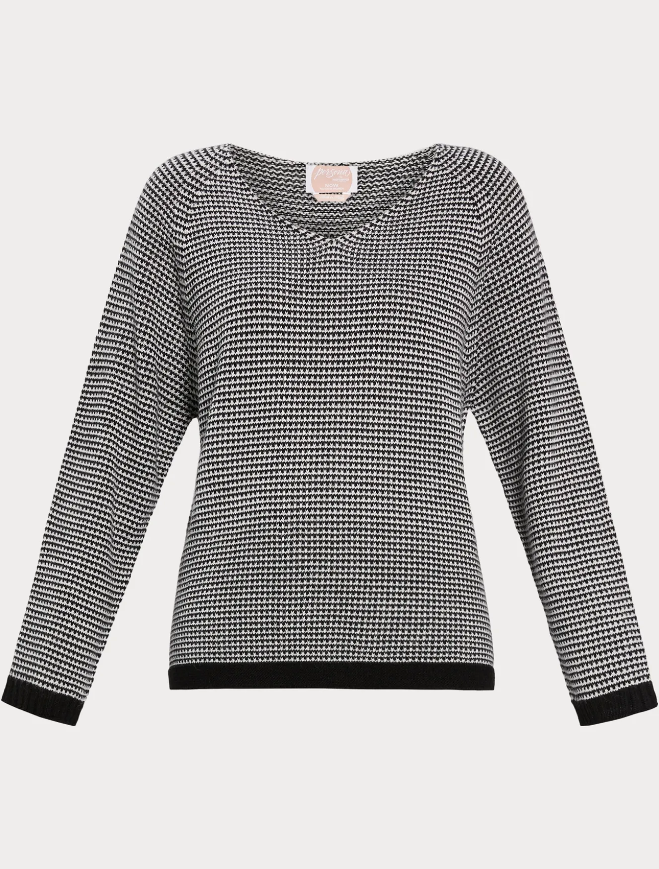 Linee essenziali per la maglia in filato di misto lana e viscosa con scollo a V e maniche raglan lunghe. La lavorazione con effetto bi-color caratterizza il capo.Il capo fa parte della collezione N.O.W.
