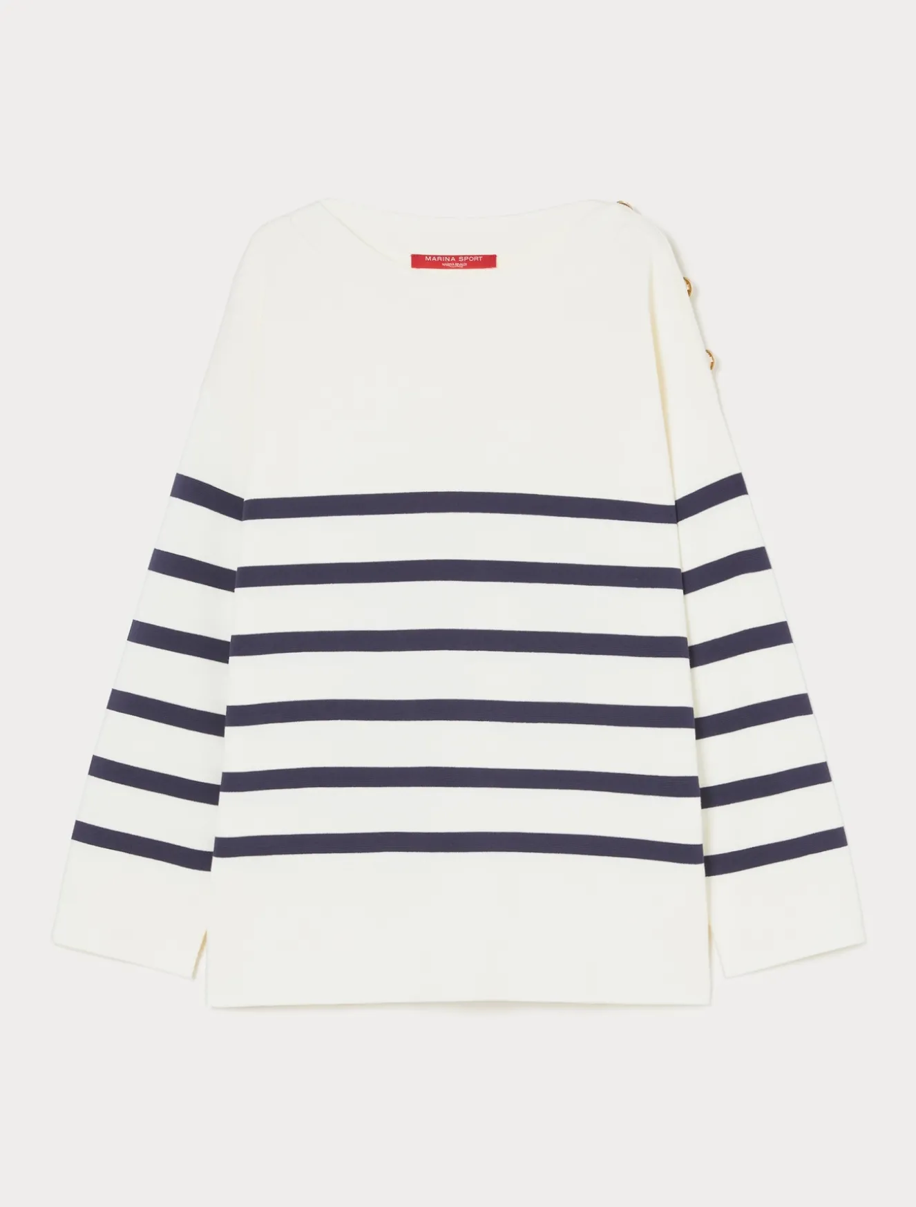 La maglia di cotone crêpe è dettagliata da un’apertura con bottoni sulla spalla. Un capo versatile da abbinare con facilità.