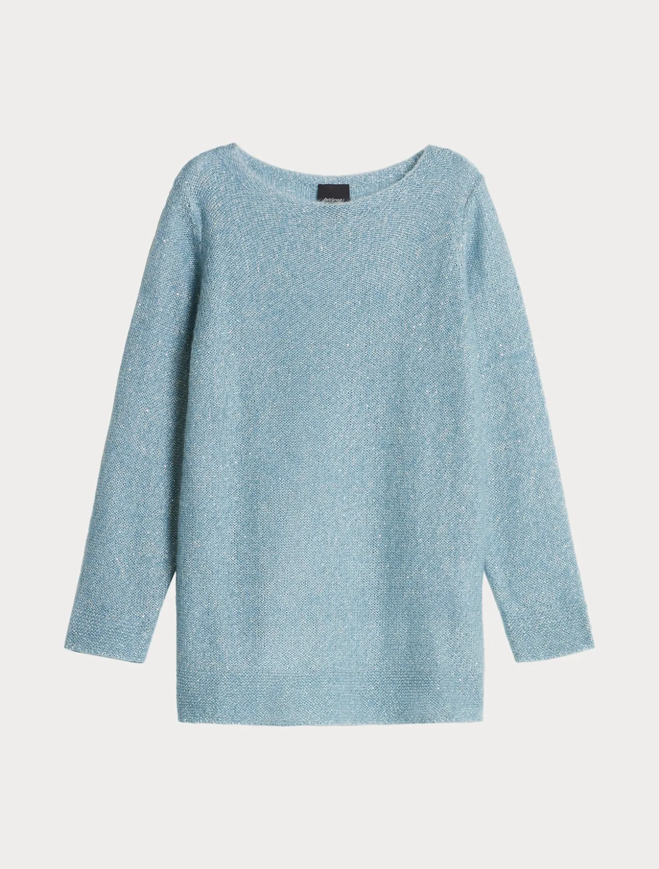 Texture da accarezzare e dettagli di luce per la maglia in filato di misto mohair con paillettes. Il capo fa parte della collezione Persona by Marina Rinaldi.