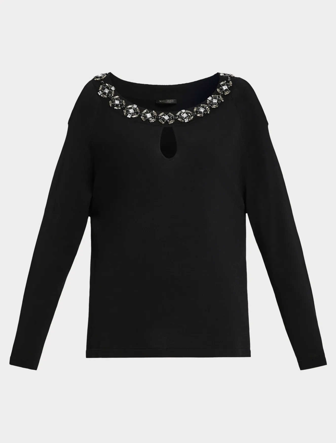 Dettagli preziosi e fit semiaderente definiscono lo stile della maglia in filato di viscosa crêpe stretch. È impreziosita da una passamaneria di ricami a castoni jais e crystal. Il capo fa parte della collezione Elegante.