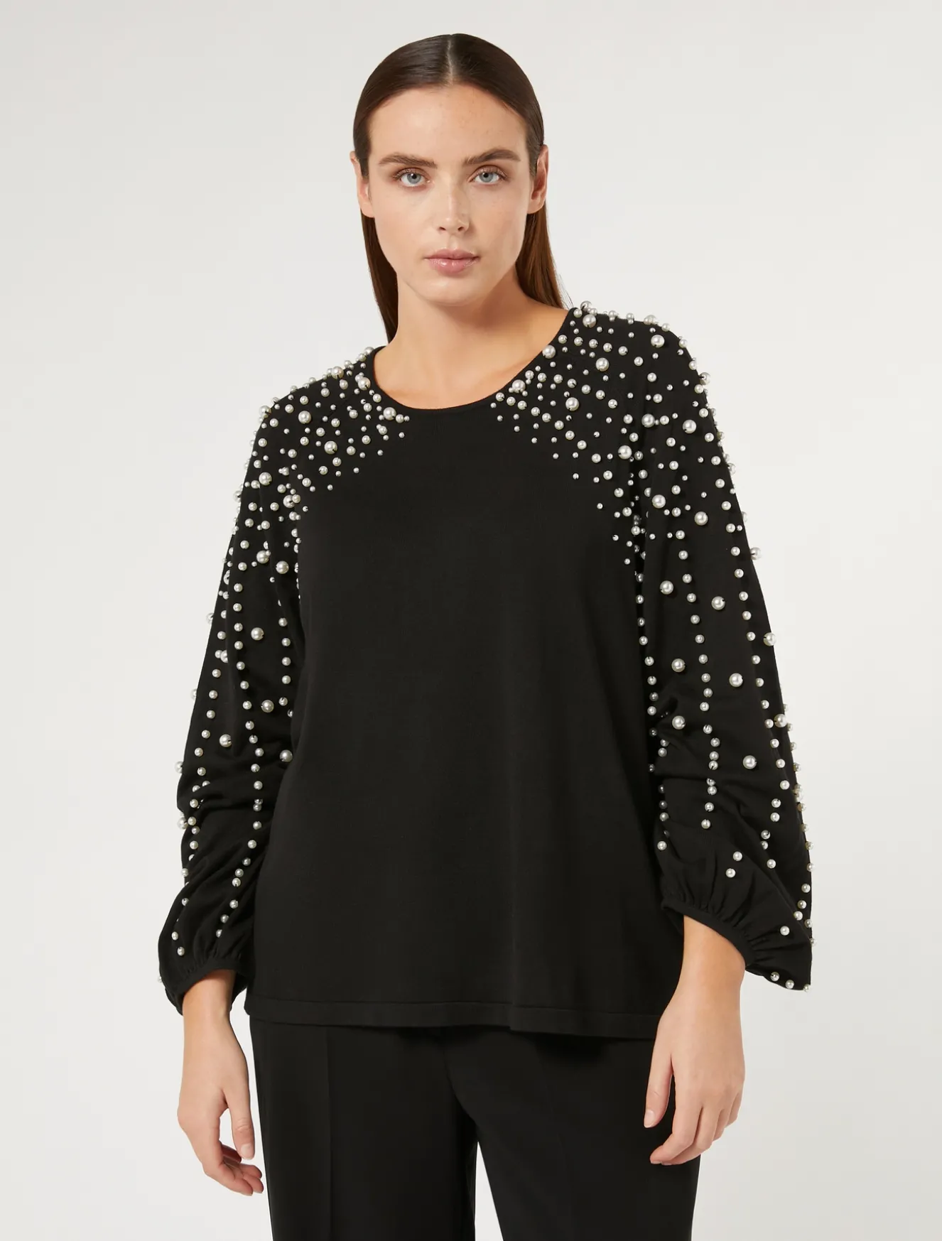 È impreziosita da un ricamo di perle cucite a mano la maglia in filato di viscosa stretch mano calda. Un knitwear bijoux per completare i tuoi look specialiIl capo fa parte della collezione Elegante.