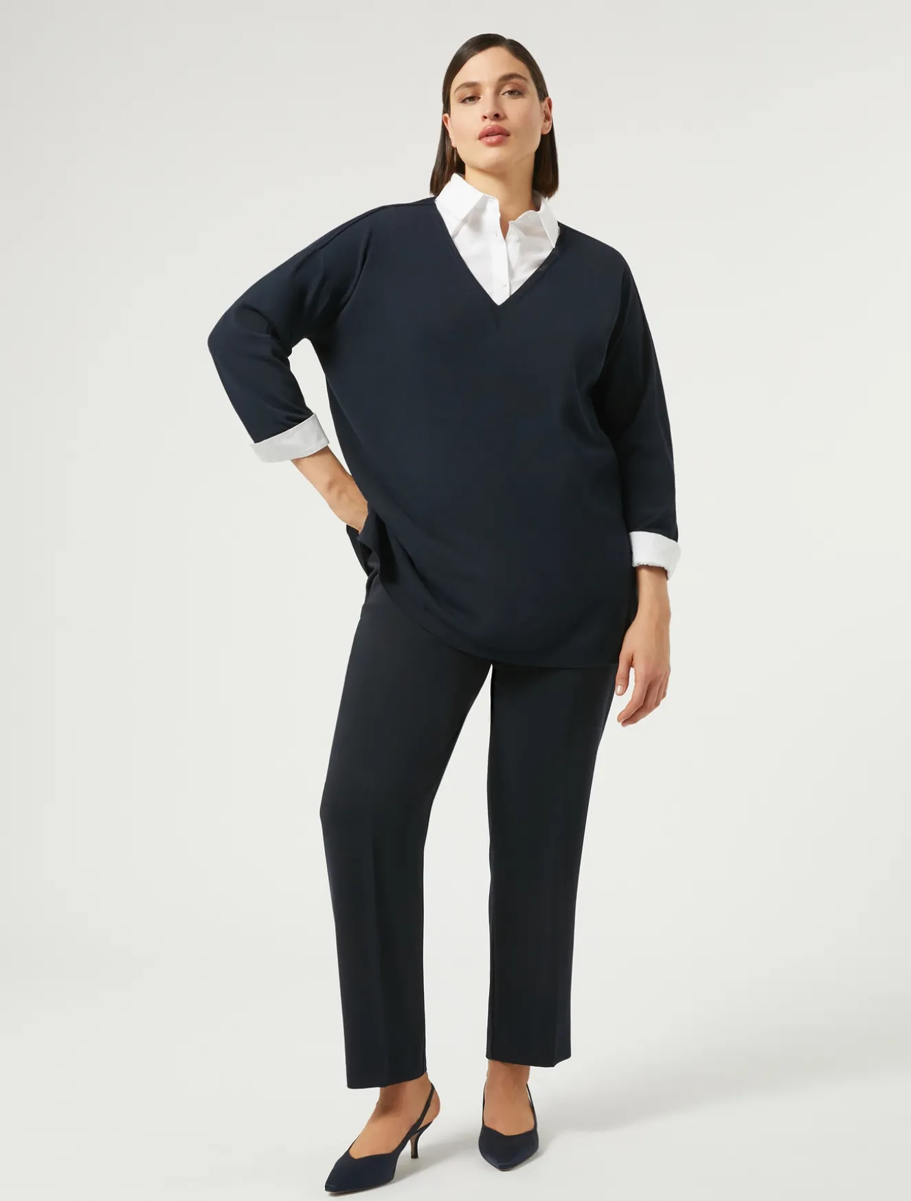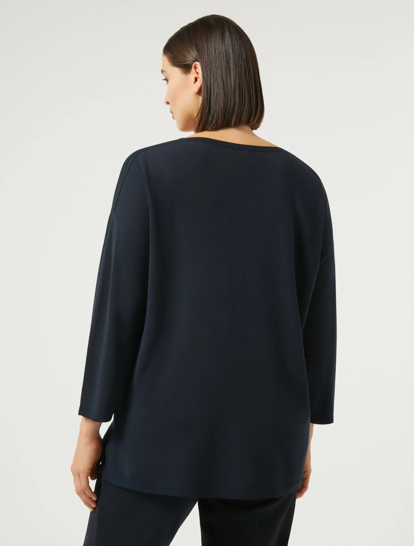 Linee essenziali per la maglia in viscosa stretch crêpe con scollo a V e maniche a tre quarti. La lavorazione a punto rasato dona carattere alla texture del capo.Il capo fa parte della collezione Persona by Marina Rinaldi.