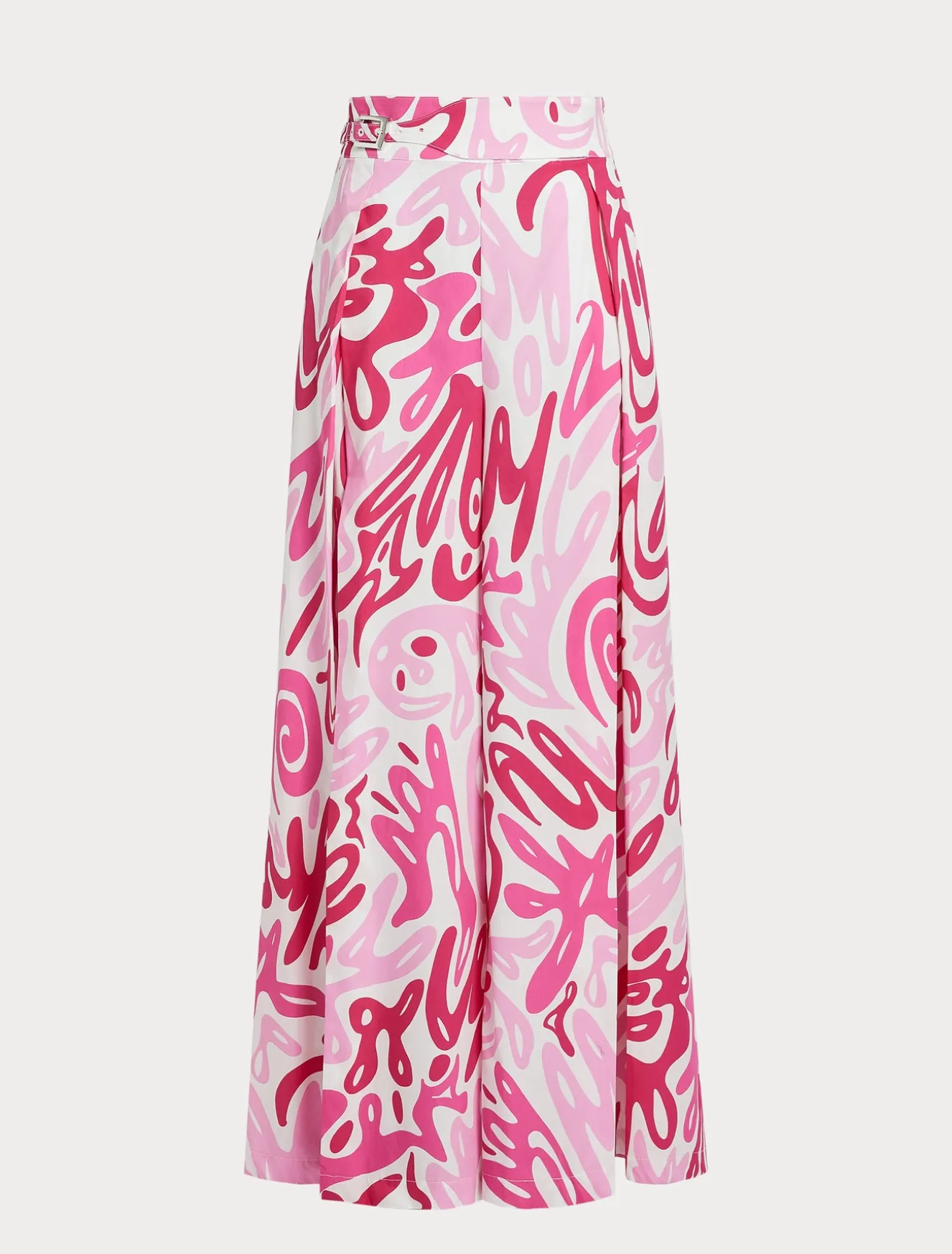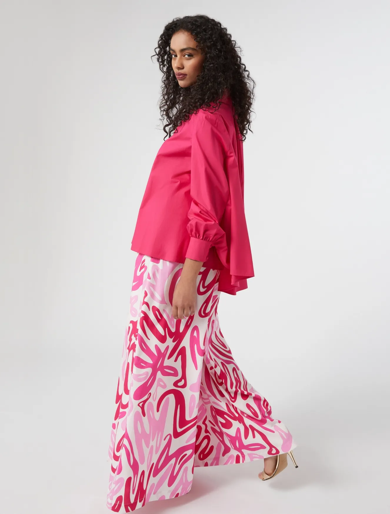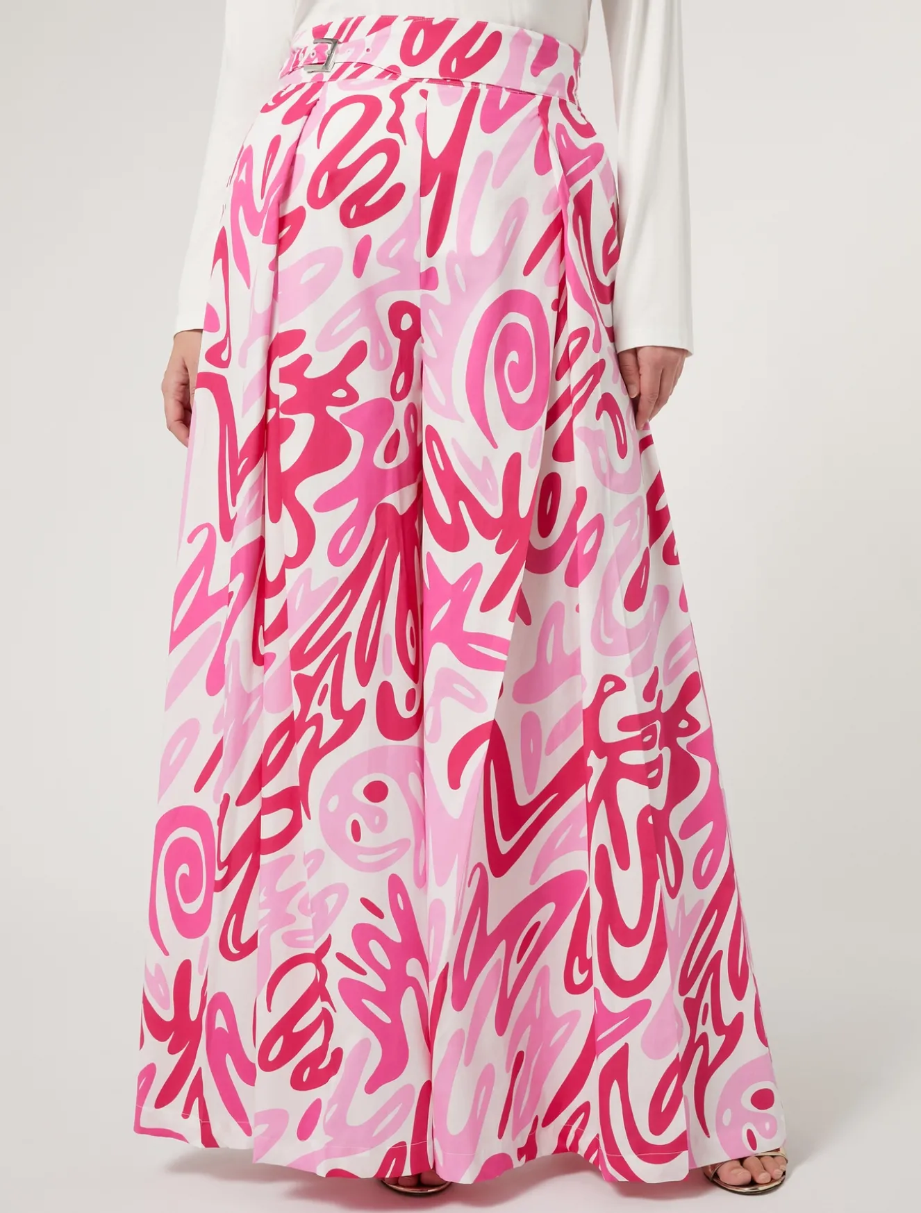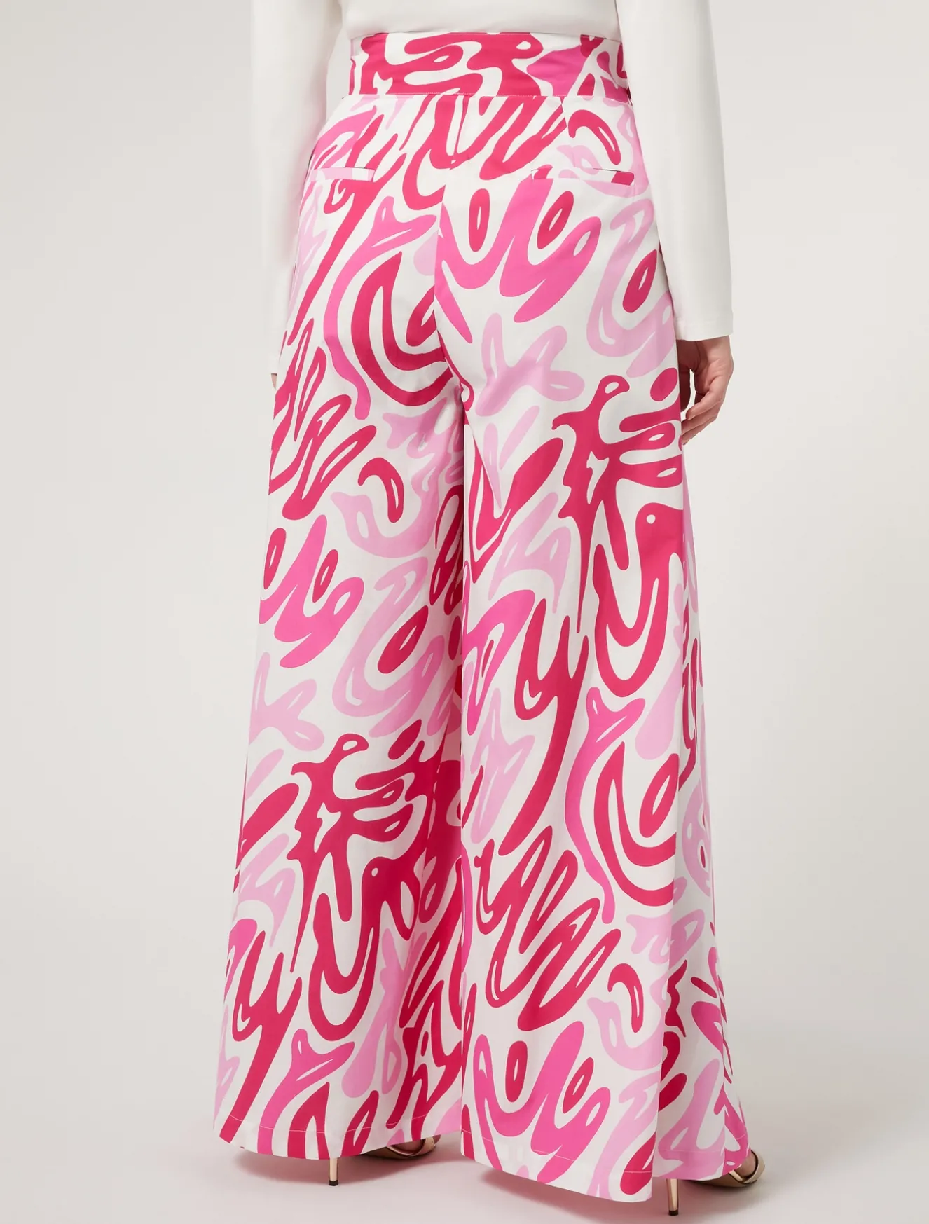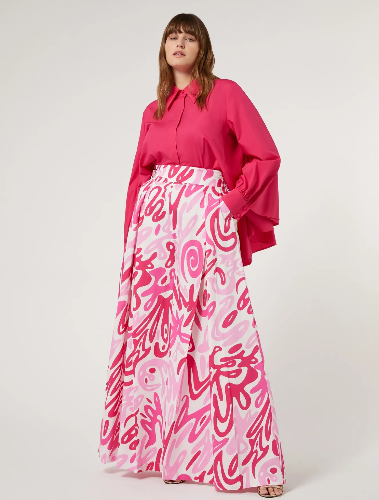 Stampa esclusiva per i pantaloni ampi in popeline con contropieghe davanti. La vita ha una costruzione sartoriale effetto cintura con fibbia in metallo.Il capo fa parte della Capsule Sara Battaglia di Marina Rinaldi.