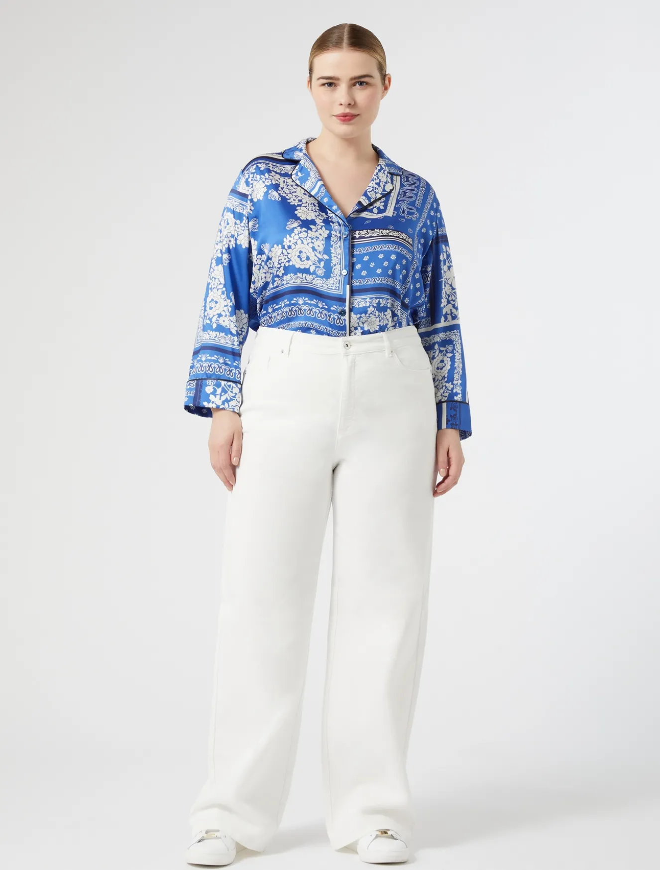 Indossa come vuoi i pantaloni in bull di cotone stretch tinto capo, dalla linea a palazzo. Base perfetta di una miriade di look off duty.