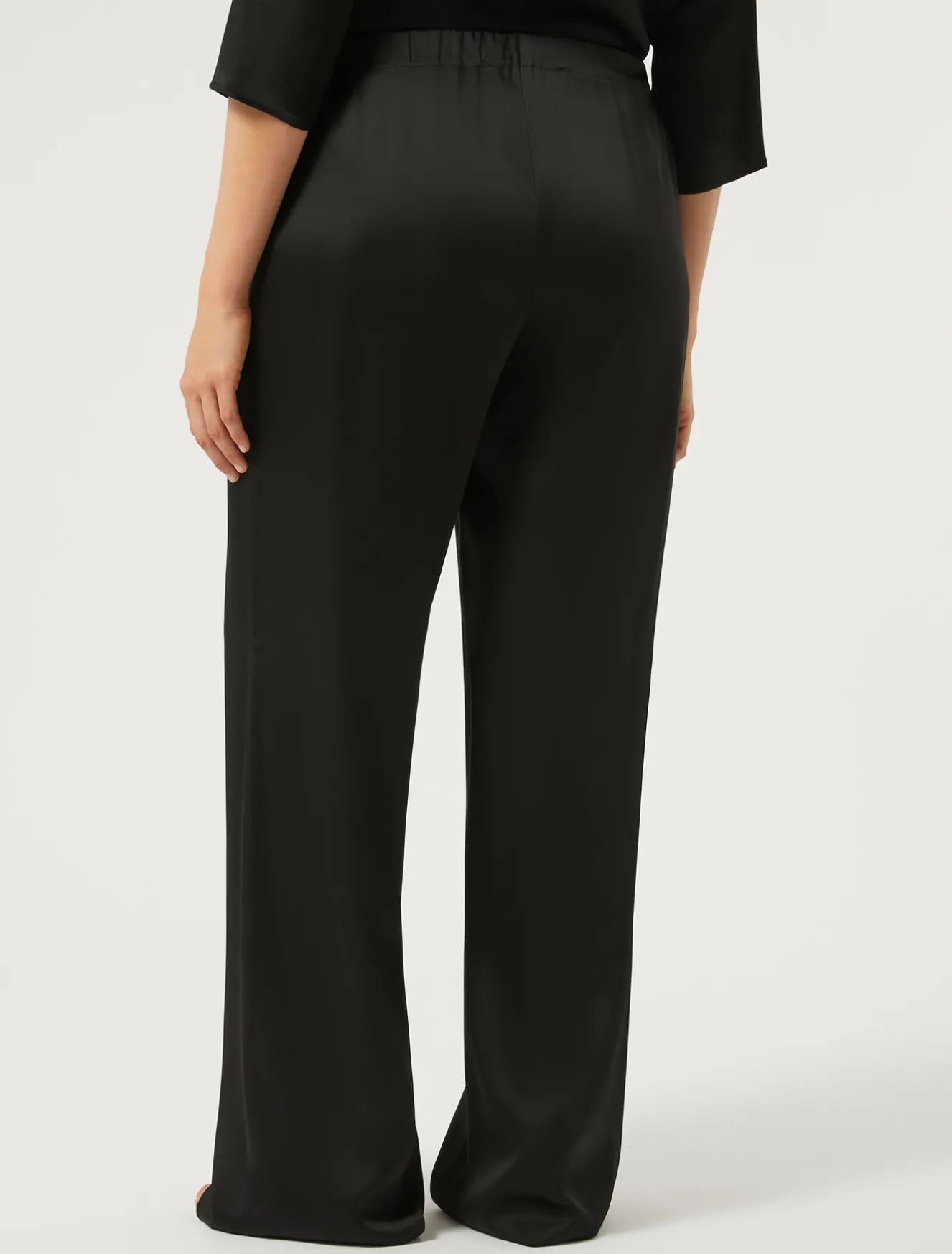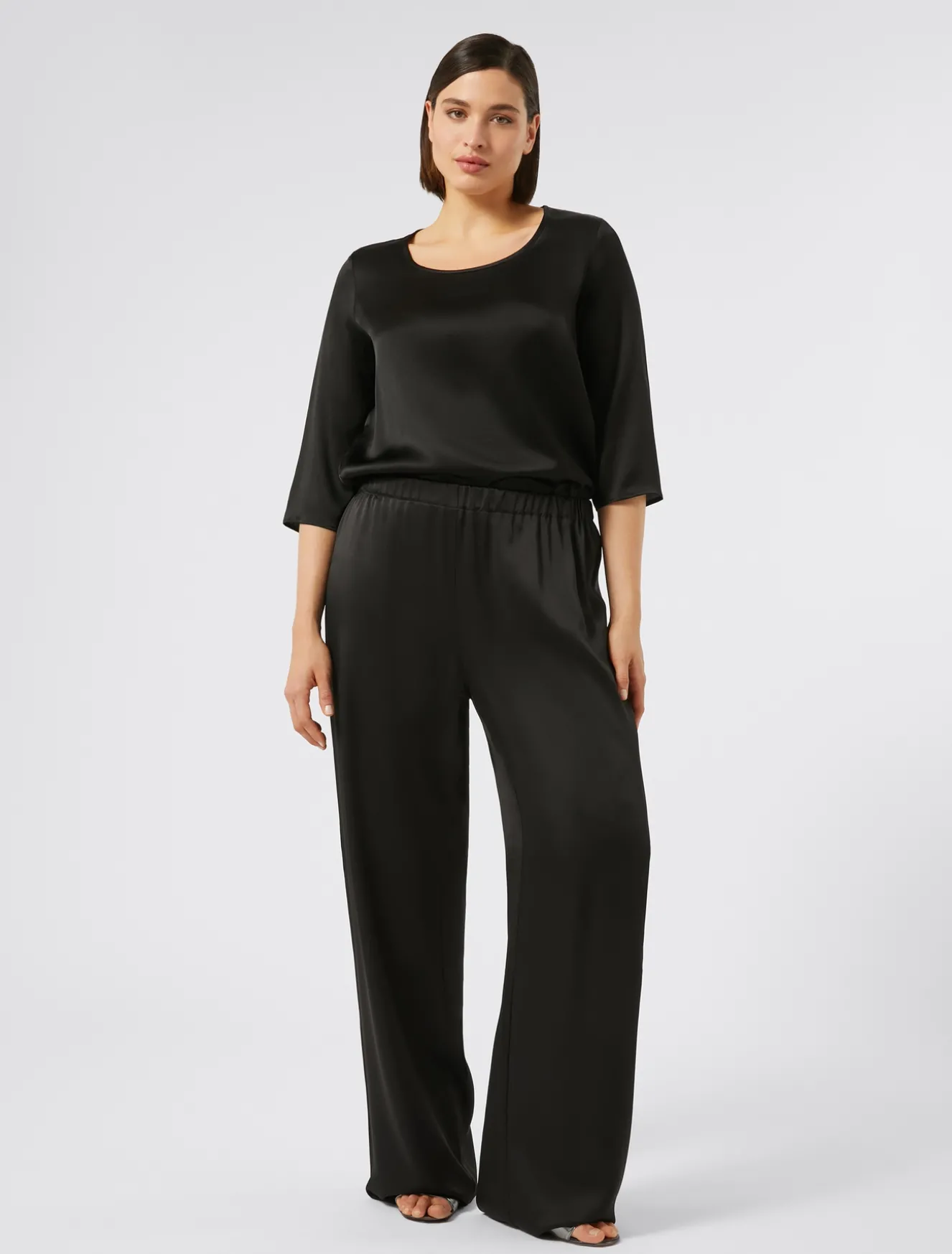 Eleganza passe-partout per i pantaloni in frisottino lucido, dalla linea ampia. Si indossano in un attimo grazie all’elastico in vita.