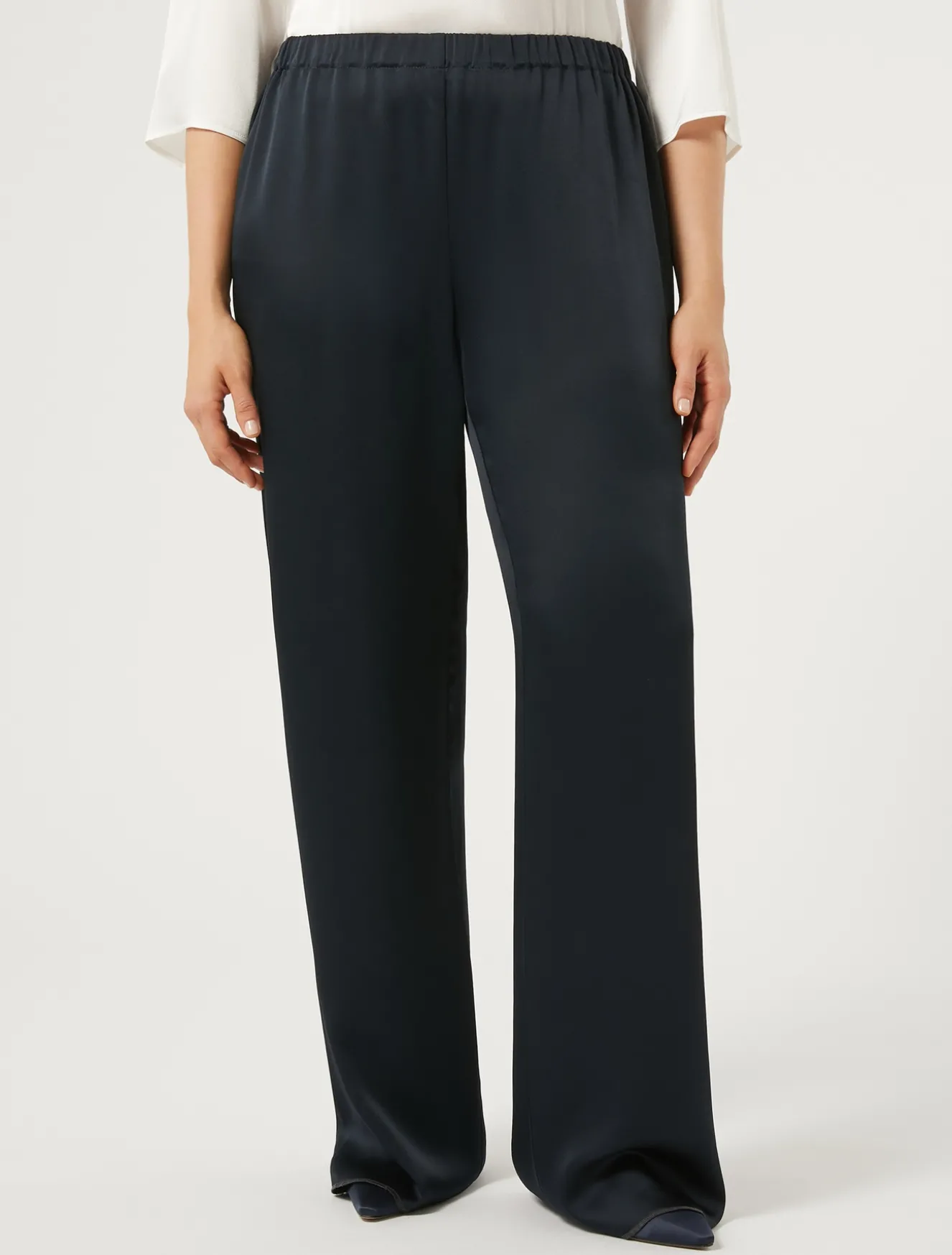 Eleganza passe-partout per i pantaloni in frisottino lucido, dalla linea ampia. Si indossano in un attimo grazie all’elastico in vita.