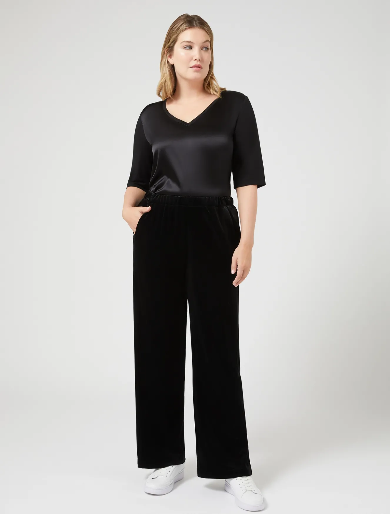 Linea dritta che disegna la silhouette per i pantaloni in morbido jersey di velluto fluido. Un capo indispensabile per unire eleganza e comfort quotidiano, da abbinare anche al blazer in coordinato.Il capo fa parte della collezione Voyage Relax.