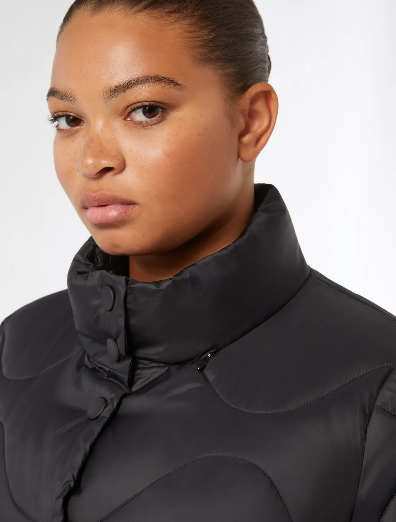 Un alleato dello stile di stagione l’imbottito in tela di nylon antigoccia con cappuccio, maniche lunghe e tasche a filettone. Il capo fa parte della collezione NOW by Marina Rinaldi.