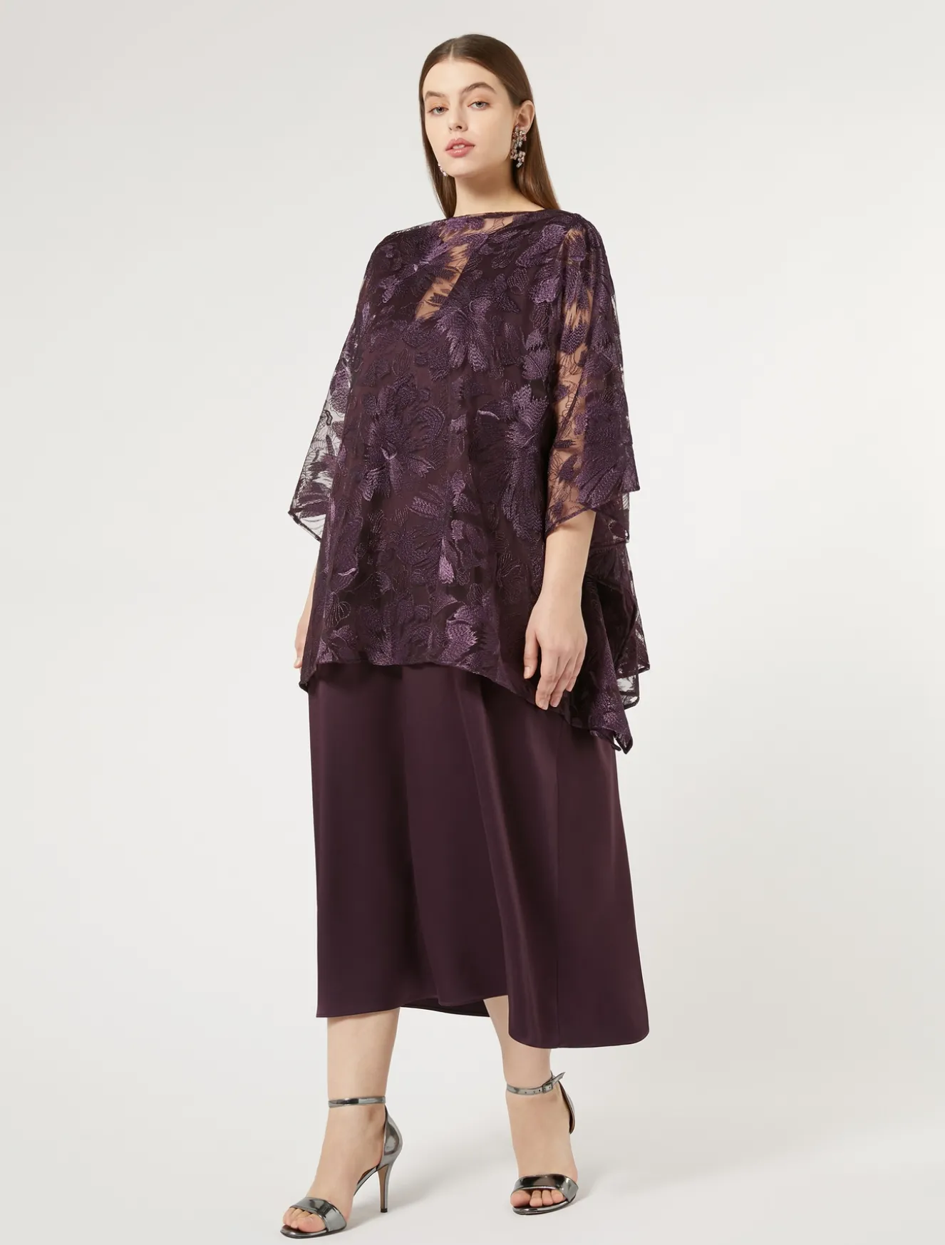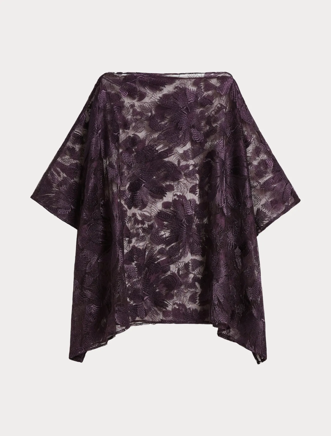 Disegno floreale esclusivo per il ricamo protagonista del poncho in tulle. Completamento perfetto per i look delle occasioni speciali. Il capo fa parte della collezione Elegante.