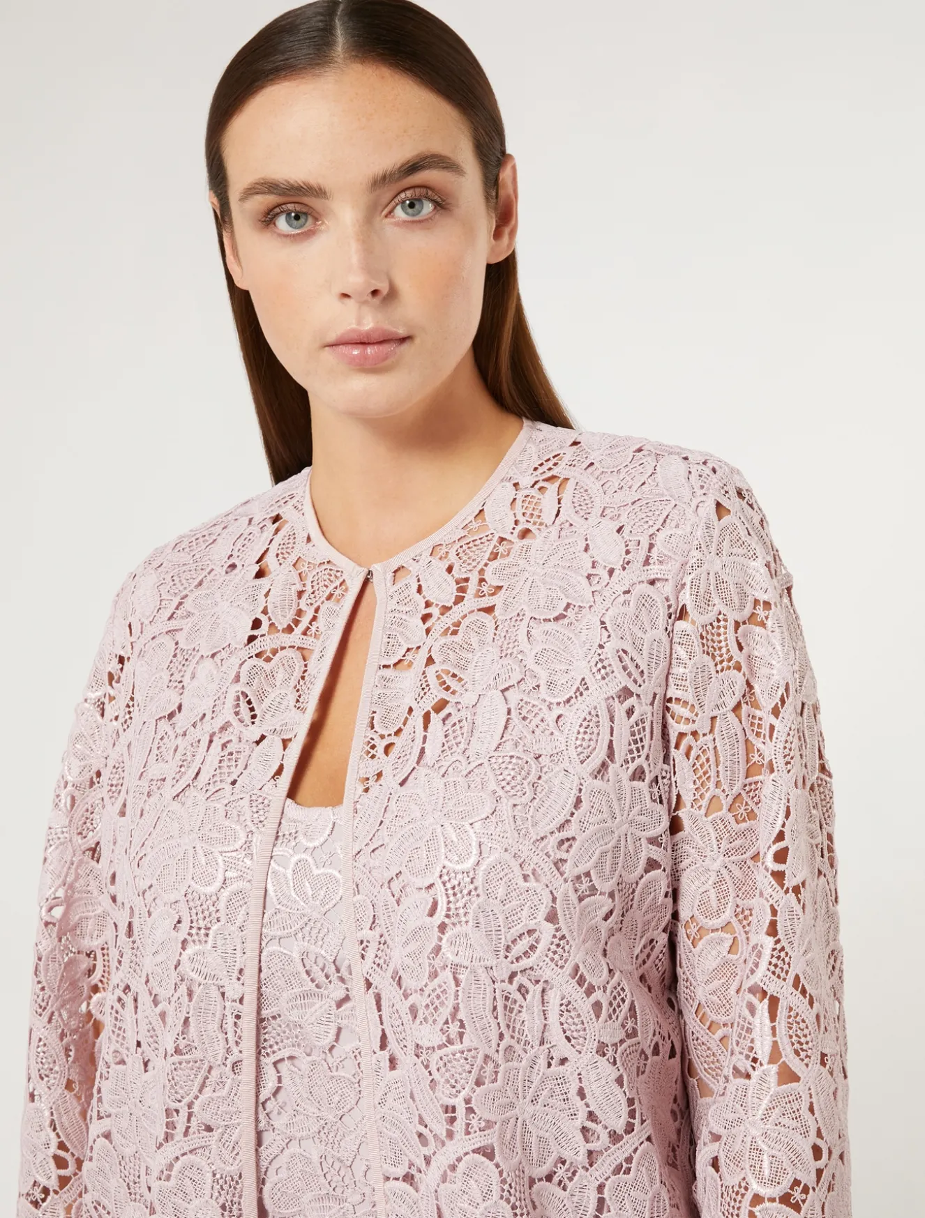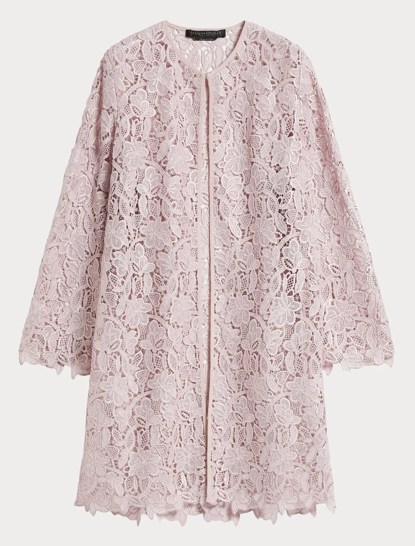 Pizzo macramè laminato ricercato per il soprabito rifinito da gros-grain in tinta e fondi smerlati. Donerà una nota raffinata a tutti i tuoi outfit speciali.Il capo fa parte della collezione Elegante.