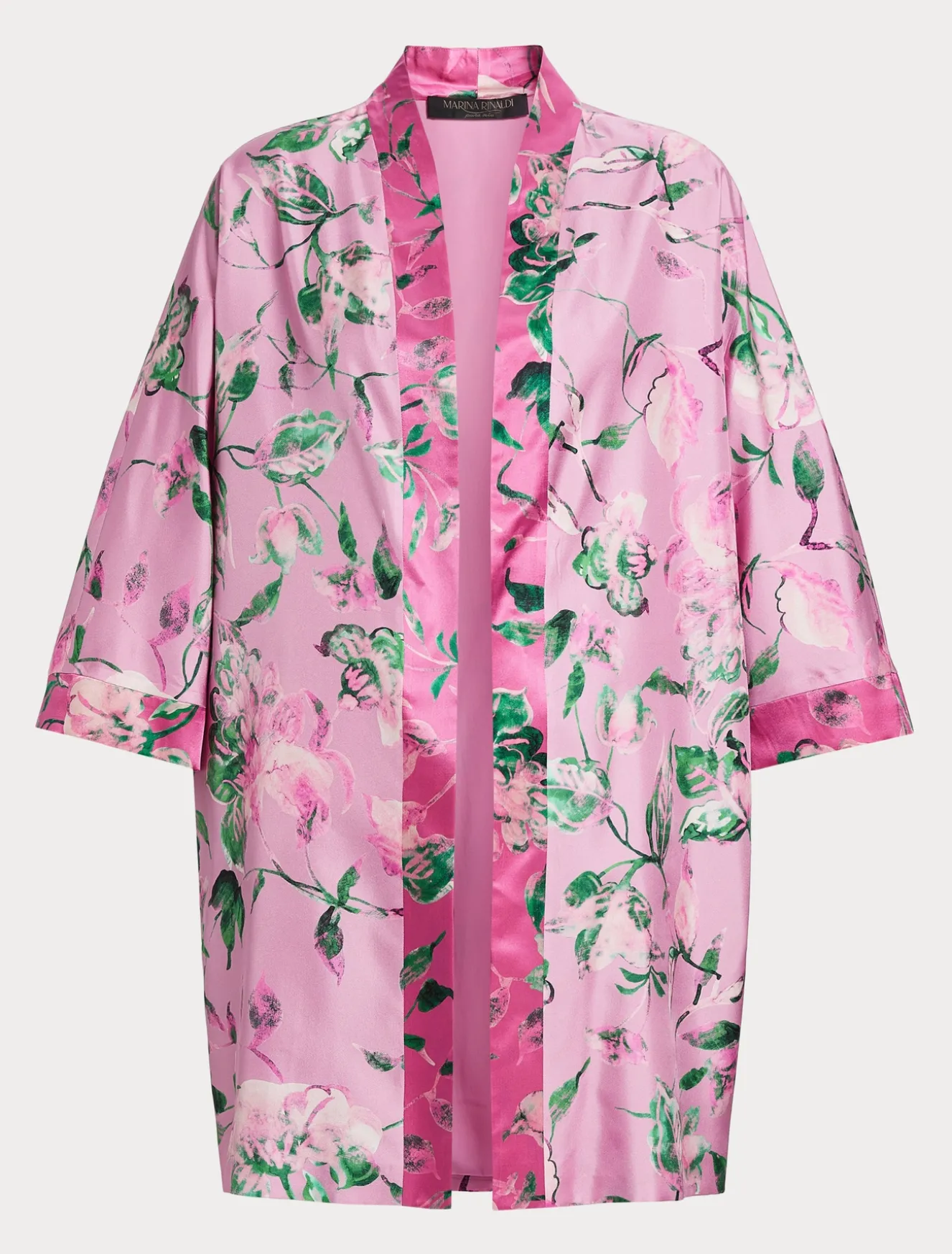 Stampa esclusiva a fiori stilizzati per lo spolverino in twill di seta, dalla linea a kimono con bordi davanti e fondo manica in raso di seta con stampa in coordinato. Donerà un twist inaspettato a tutti i tuoi outfit speciali, anche in abbinamento al top e ai pantaloni in coordinato.Il capo fa parte della collezione Elegante.