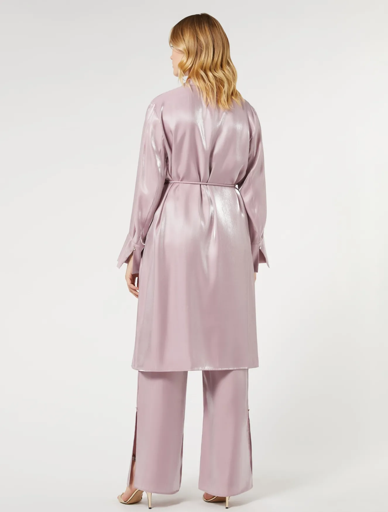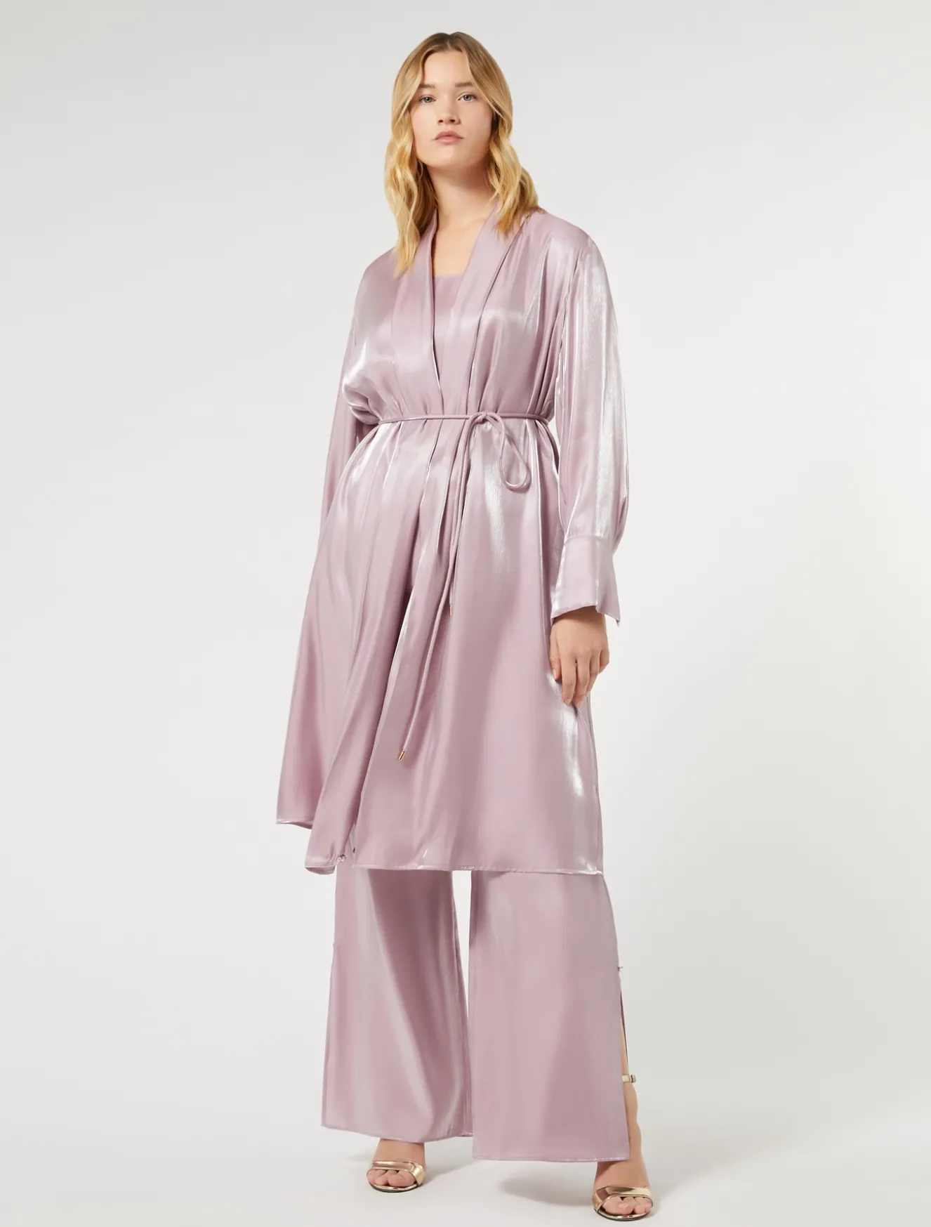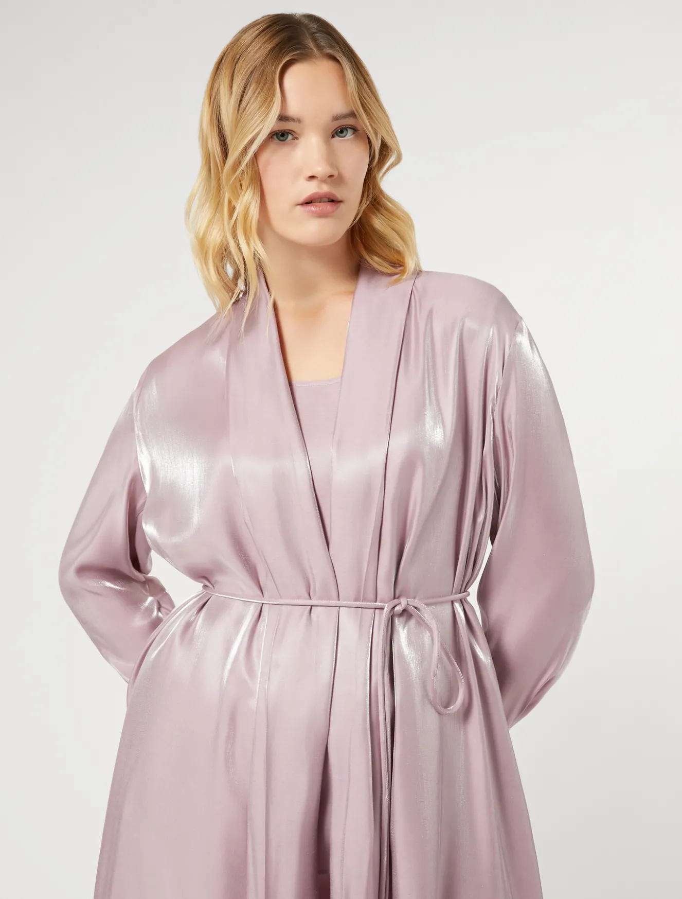 Fit avvolgente per lo spolverino in viscosa con collo a scialle e maniche lunghe con polsi impreziositi da bottoni gioiello. Con la cintura coordinata regoli il volume.Il capo fa parte della collezione Persona by Marina Rinaldi.