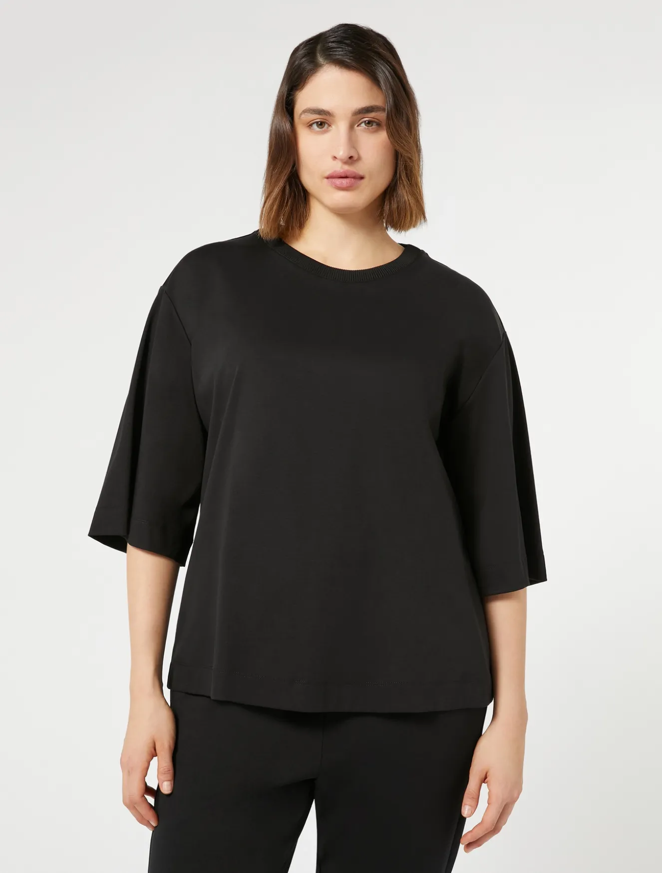 Essenziale e contemporanea la T-shirt in jersey interlock di cotone mercerizzato con collo tondo rifinito in costina di maglia. Da interpretare in una miriade di look.Il capo fa parte della collezione Voyage Relax.