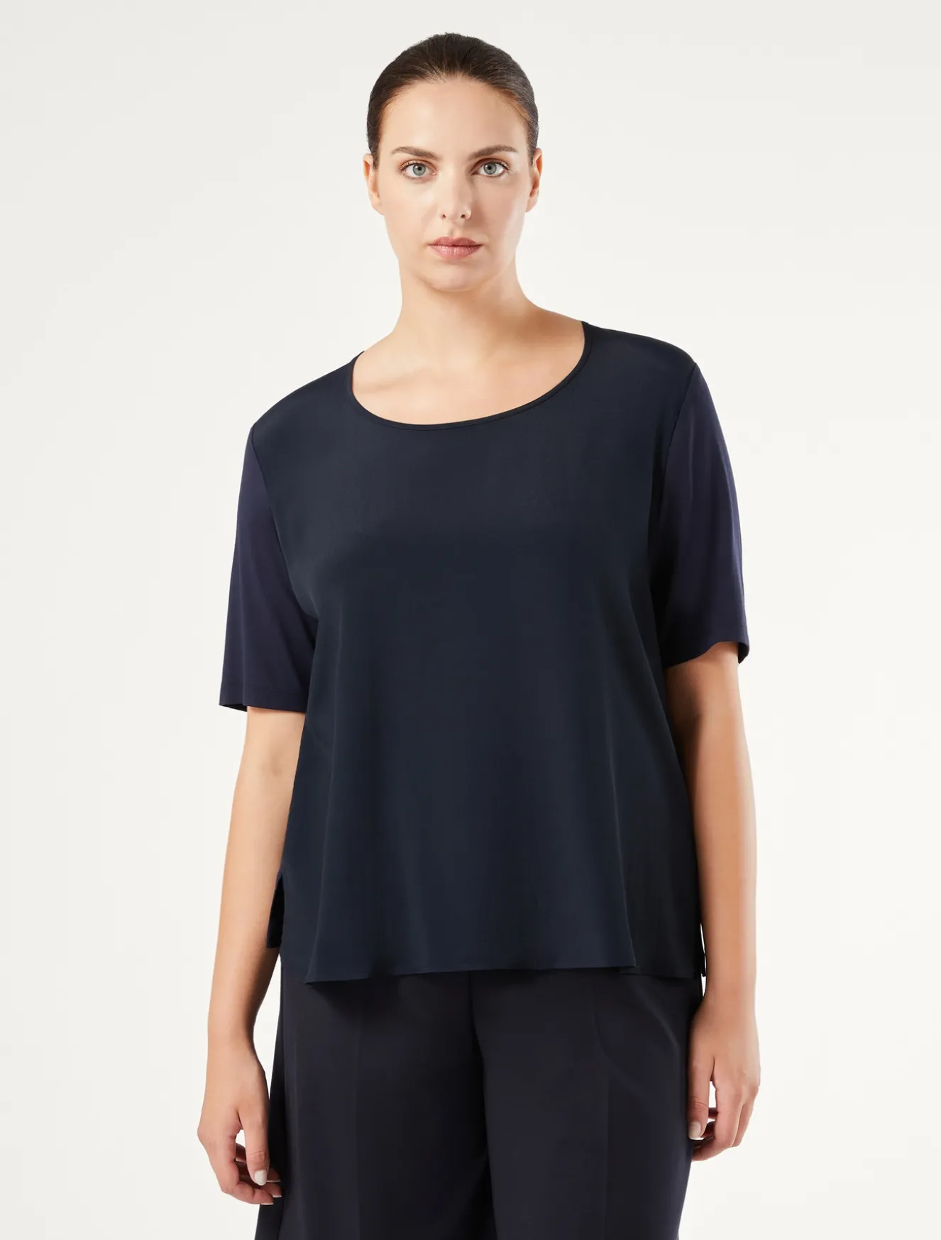 Easy con un tocco sofisticato, la T-shirt in jersey di viscosa ha scollo rotondo, maniche corte e pannello anteriore in misto seta che regala eleganza agli outfit daily.Il capo fa parte della collezione Persona by Marina Rinaldi.