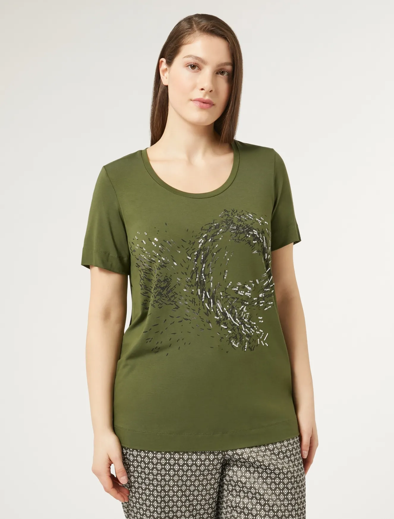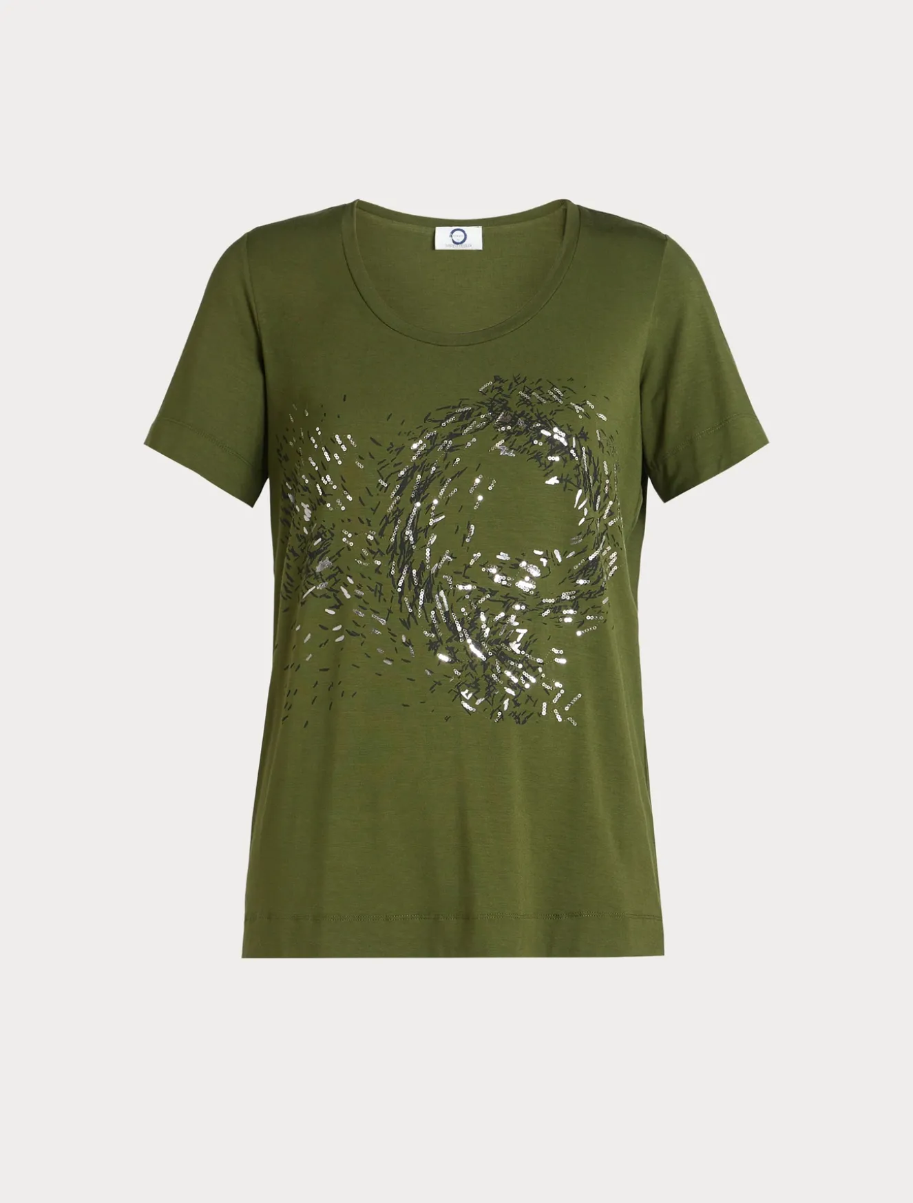 È impreziosita da ricami di paillettes e stampa la T-shirt in morbido jersey di viscosa stretch. Essenziale e chic allo stesso tempo.Il capo fa parte della collezione Voyage.