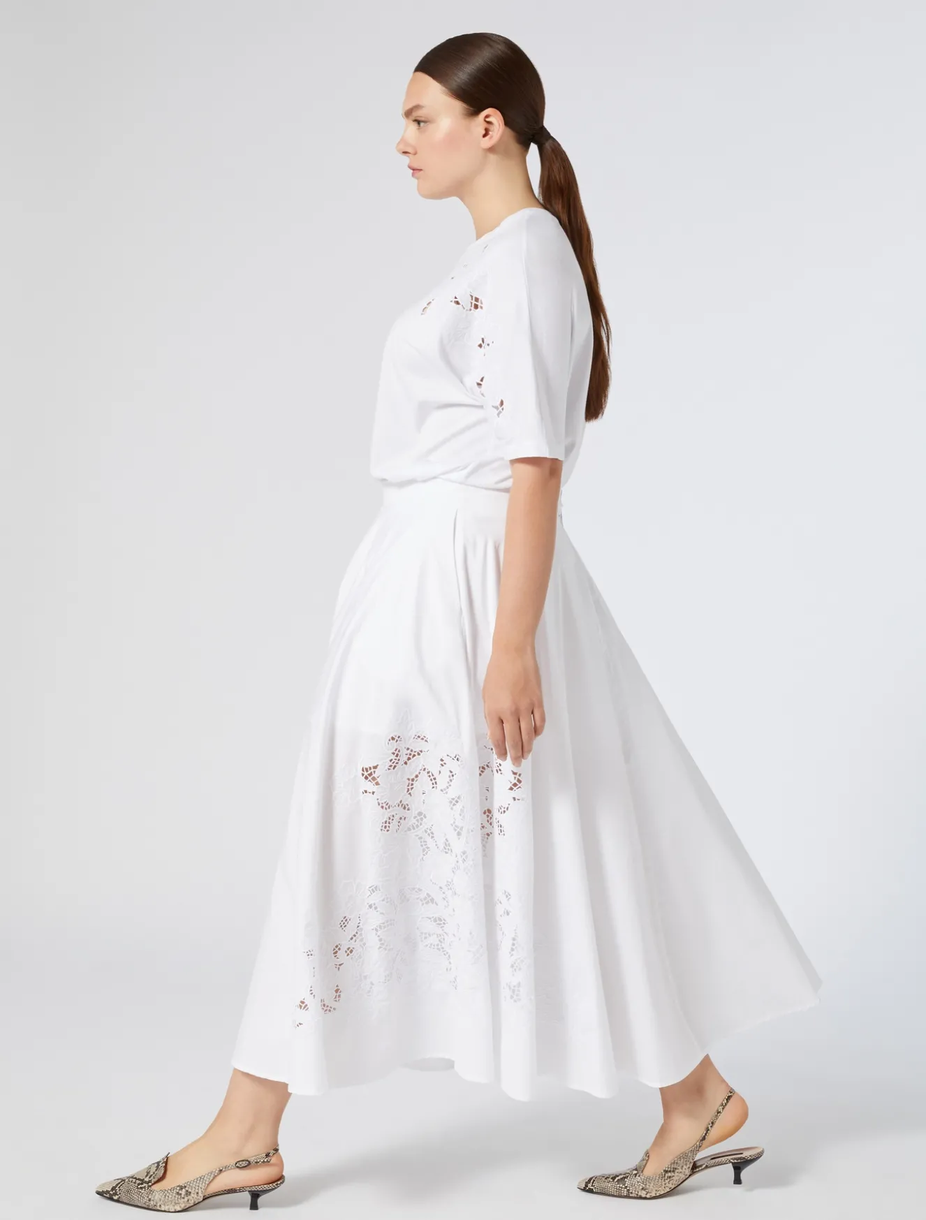 Ricamo in filo piazzato per la T-shirt in jersey di cotone, dalla linea dritta. Essenziale e chic da indossare tutti i giorni.