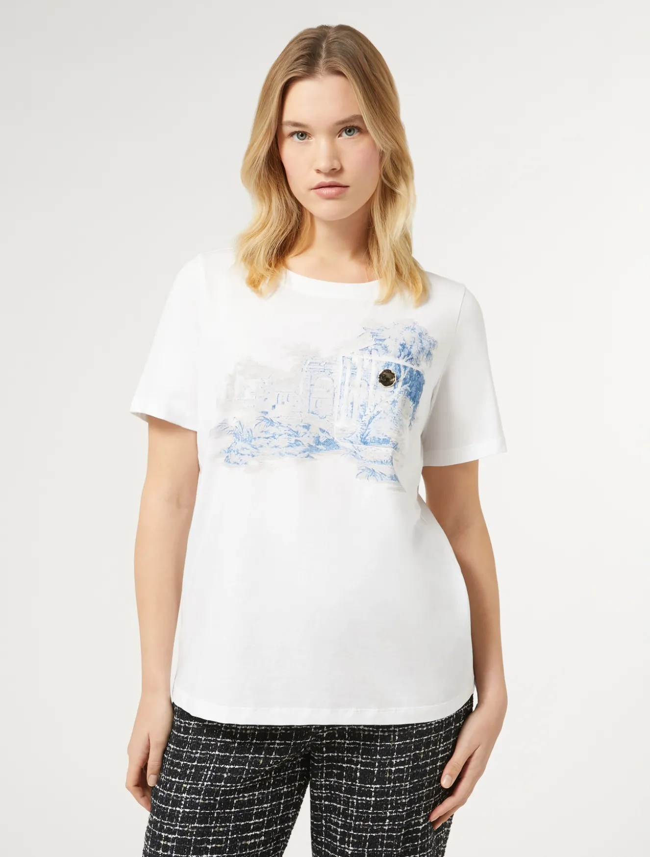 Completa i tuoi look con la T-shirt in jersey di cotone con stampa davanti, taschino e bottone gioiello. Confortevole e facile da abbinare.Il capo fa parte della main collection Marina Rinaldi.
