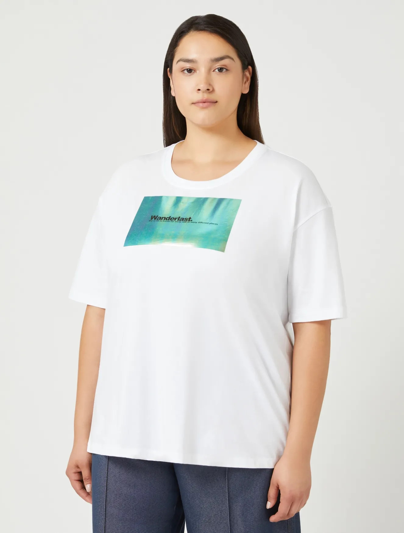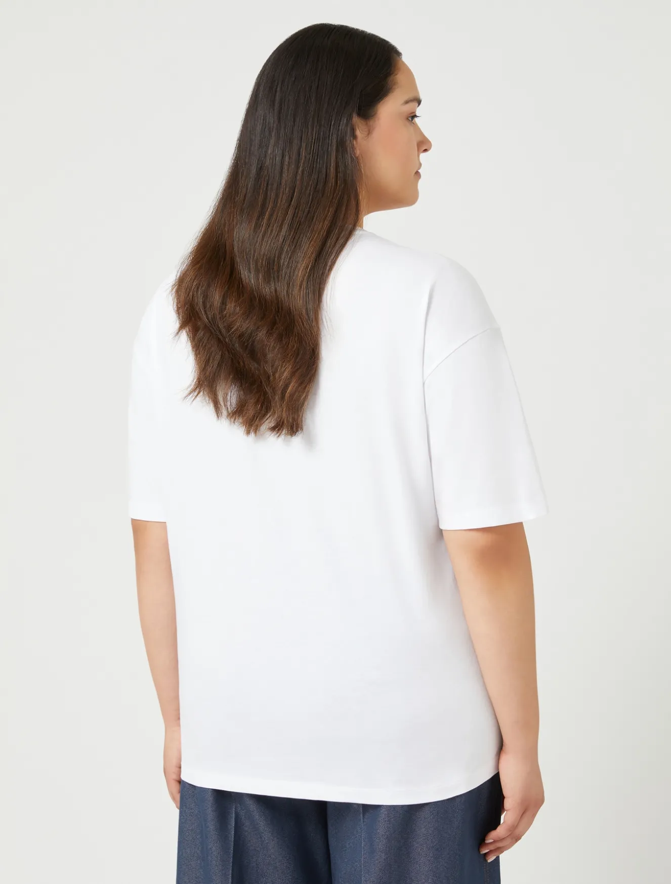 Esibisce una stampa con dettagli laminati la T-shirt in jersey di cotone, dalla linea over. Da interpretare in una miriade di look.Il capo fa parte della Capsule Sara Battaglia di Marina Rinaldi.