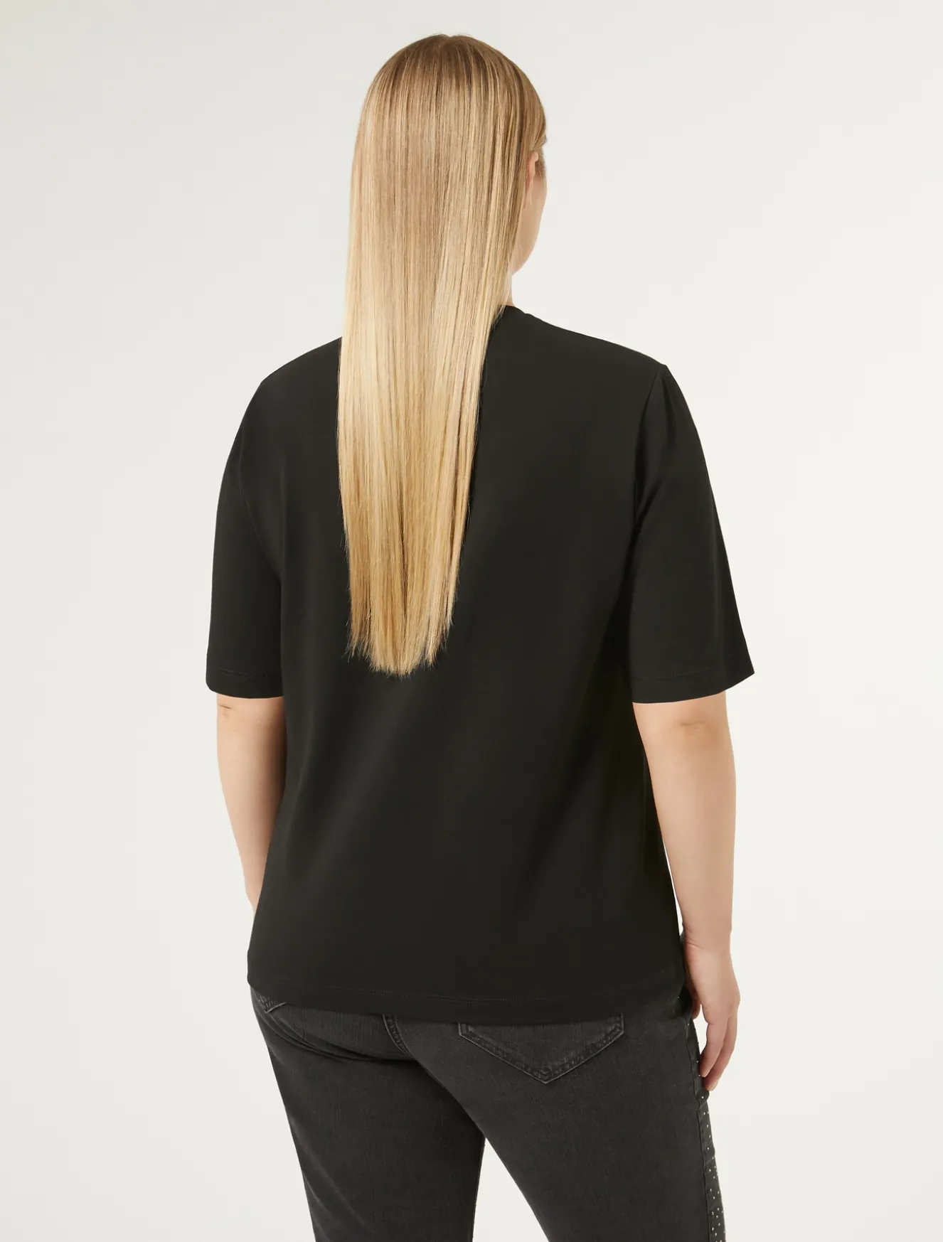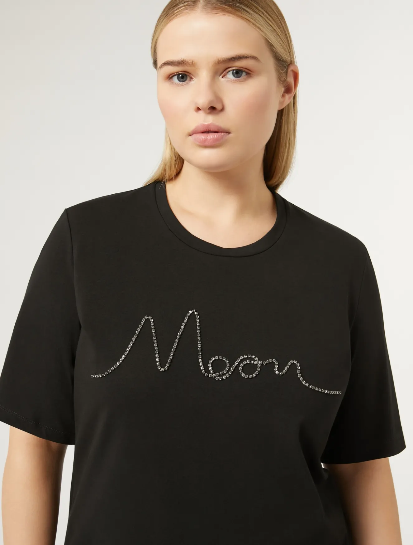 Dettagli glamour per la t-shirt in jersey di cotone stretch con scollo rotondo e maniche corte, personalizzata con stampa o motivo lettering con catenella in strass.Il capo fa parte della collezione Persona by Marina Rinaldi.