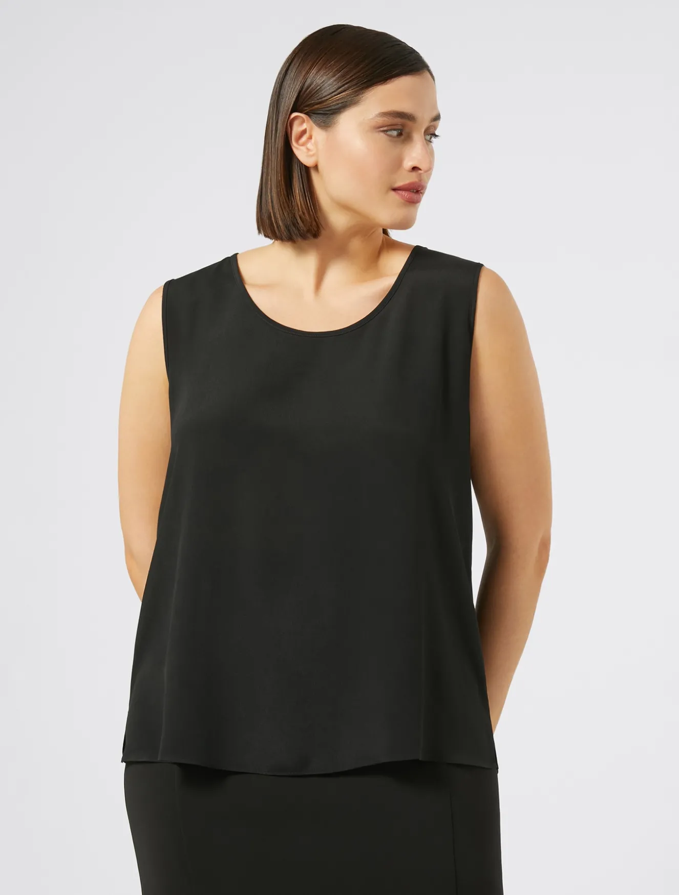 Completa i tuoi look con il top in crêpe de Chine di misto seta, dalla linea dritta. Puoi applicare le maniche corte con un intervento di sartoria dedicato. Il tessuto principale contiene materie prime derivanti dalla cellulosa del legno, fibra ricavata nel rispetto del patrimonio forestale.
