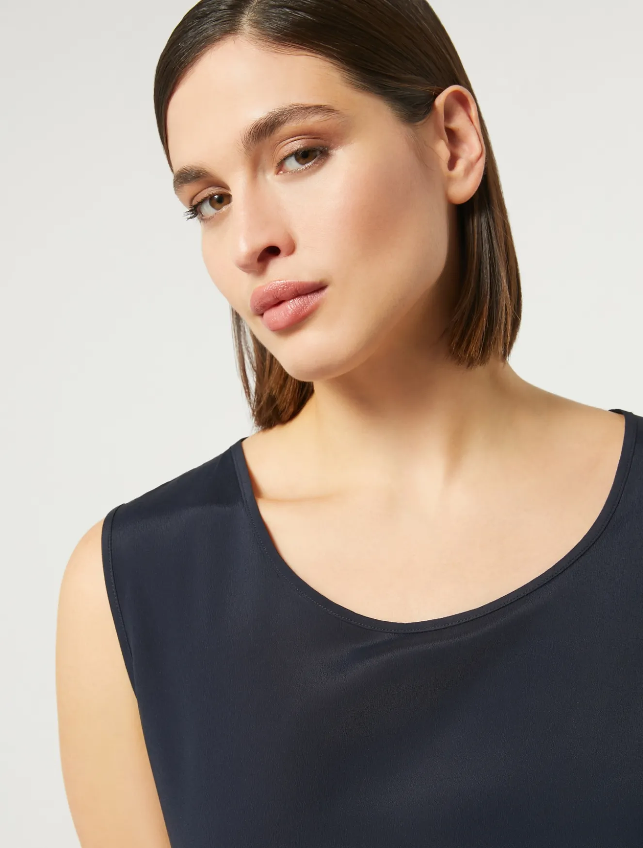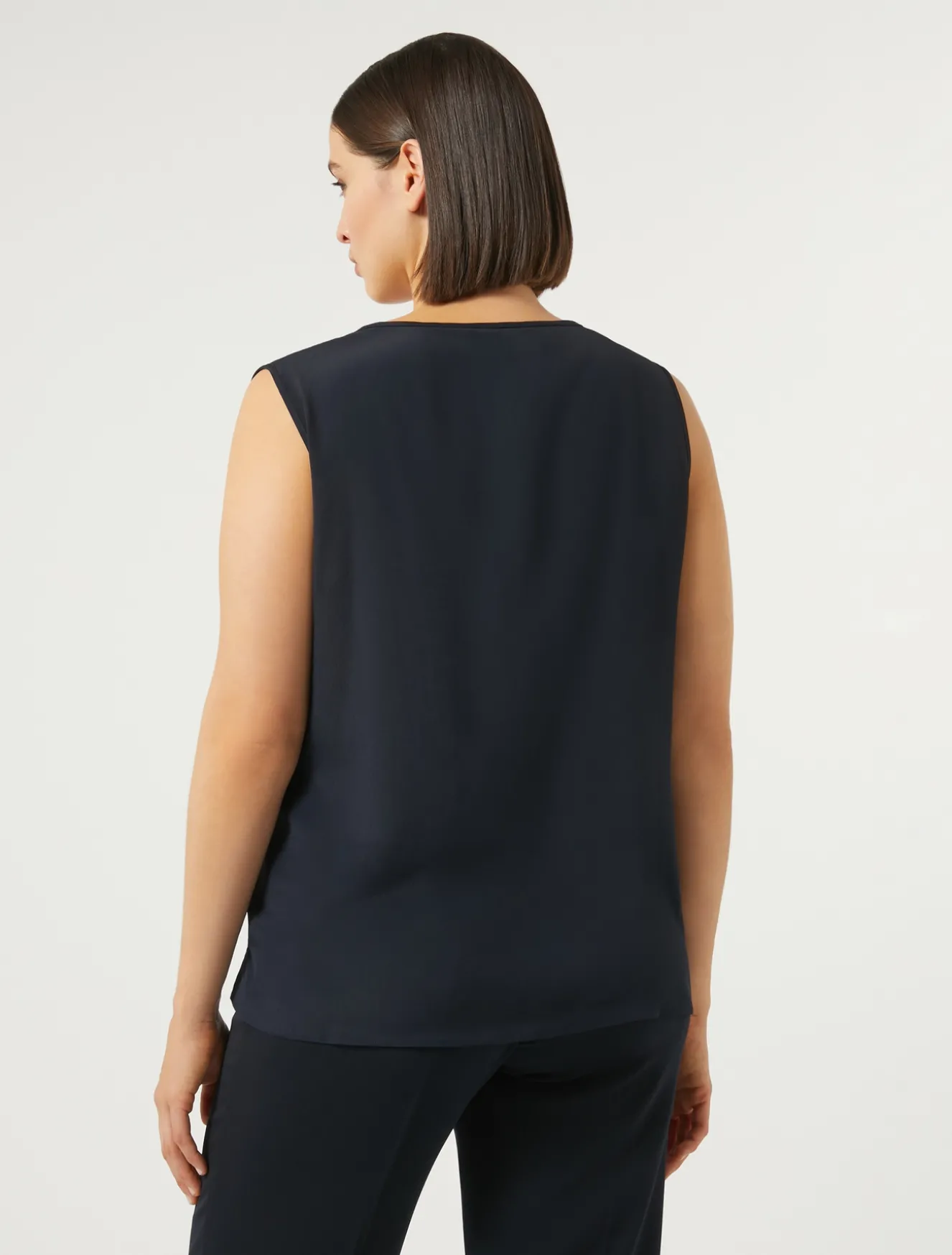 Completa i tuoi look con il top in crêpe de Chine di misto seta, dalla linea dritta. Puoi applicare le maniche corte con un intervento di sartoria dedicato. Il tessuto principale contiene materie prime derivanti dalla cellulosa del legno, fibra ricavata nel rispetto del patrimonio forestale.