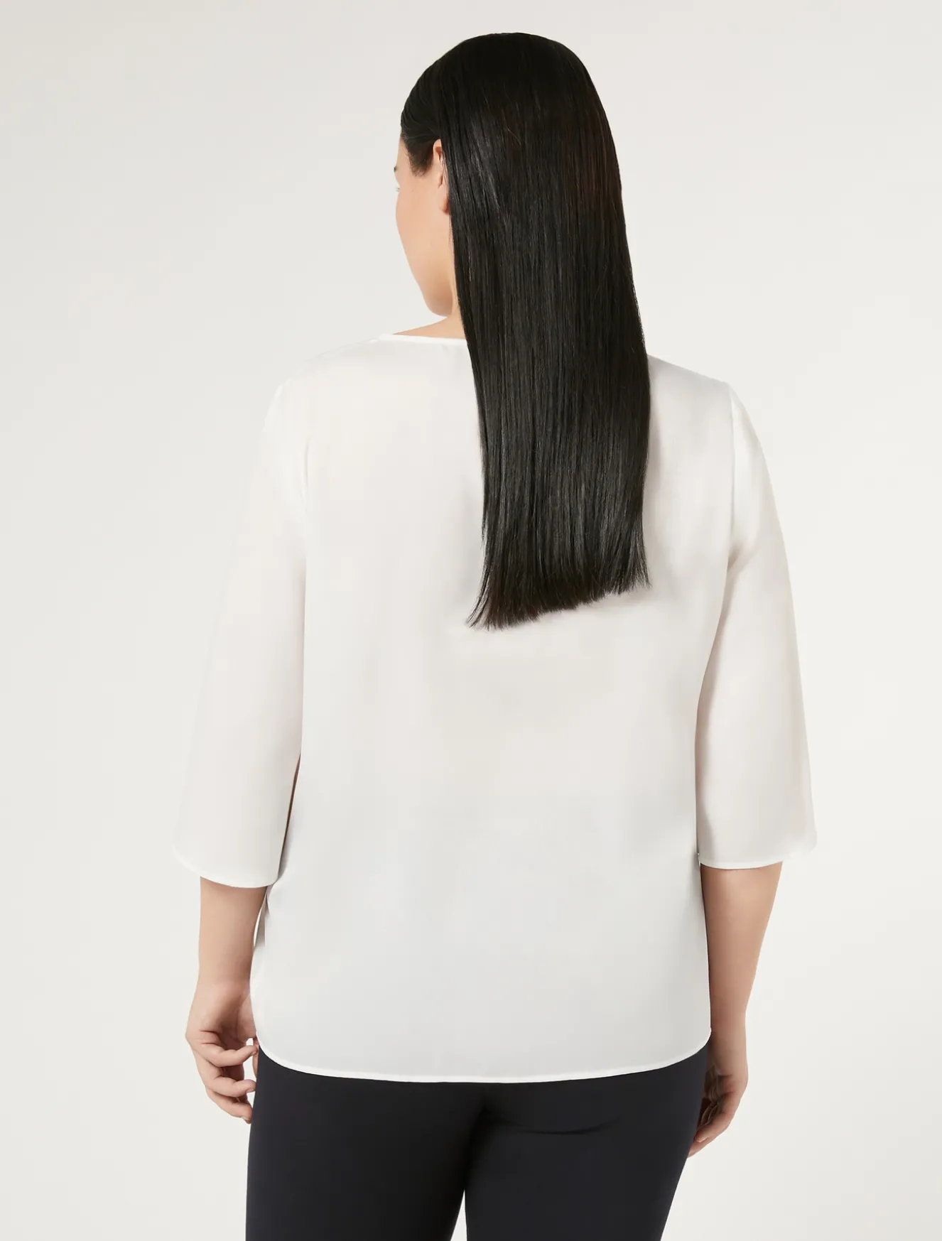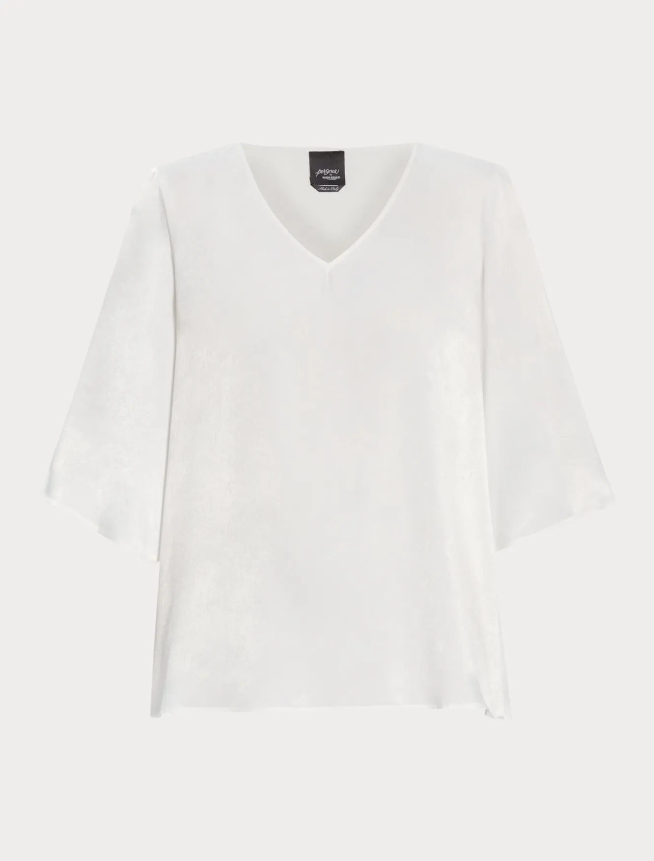 Texture sofisticate per il top in raso con scollo a V e maniche corte. Puoi indossarlo per il dailywear o come capo passe-partout per un look più elegante.Il capo fa parte della collezione Persona by Marina Rinaldi.