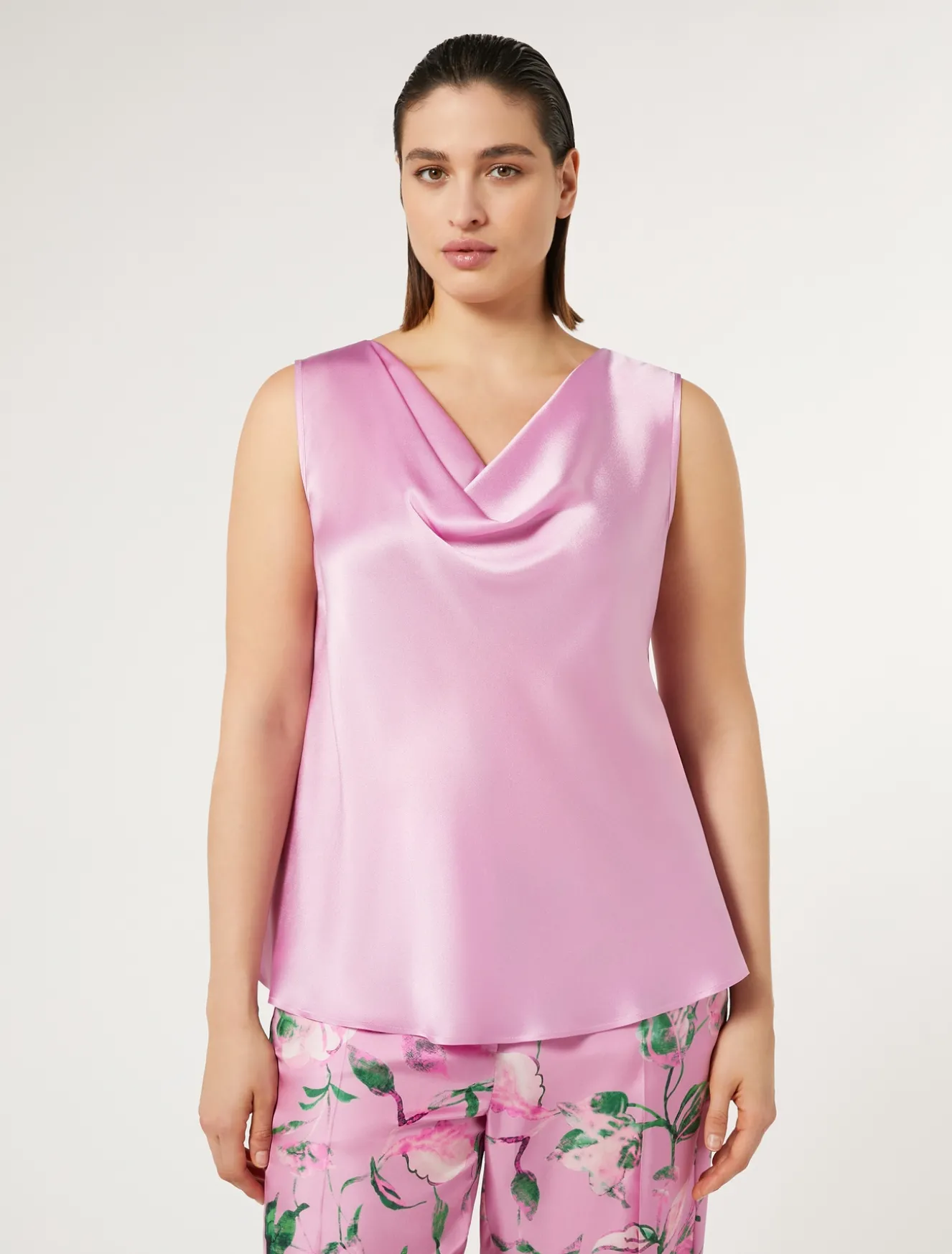 Il top in satin leggero in sbieco ha un drappeggio che crea un raffinato effetto di movimento. Puoi applicare al modello le maniche lunghe con un semplice intervento di sartoria dedicato. Il capo fa parte della collezione Elegante.