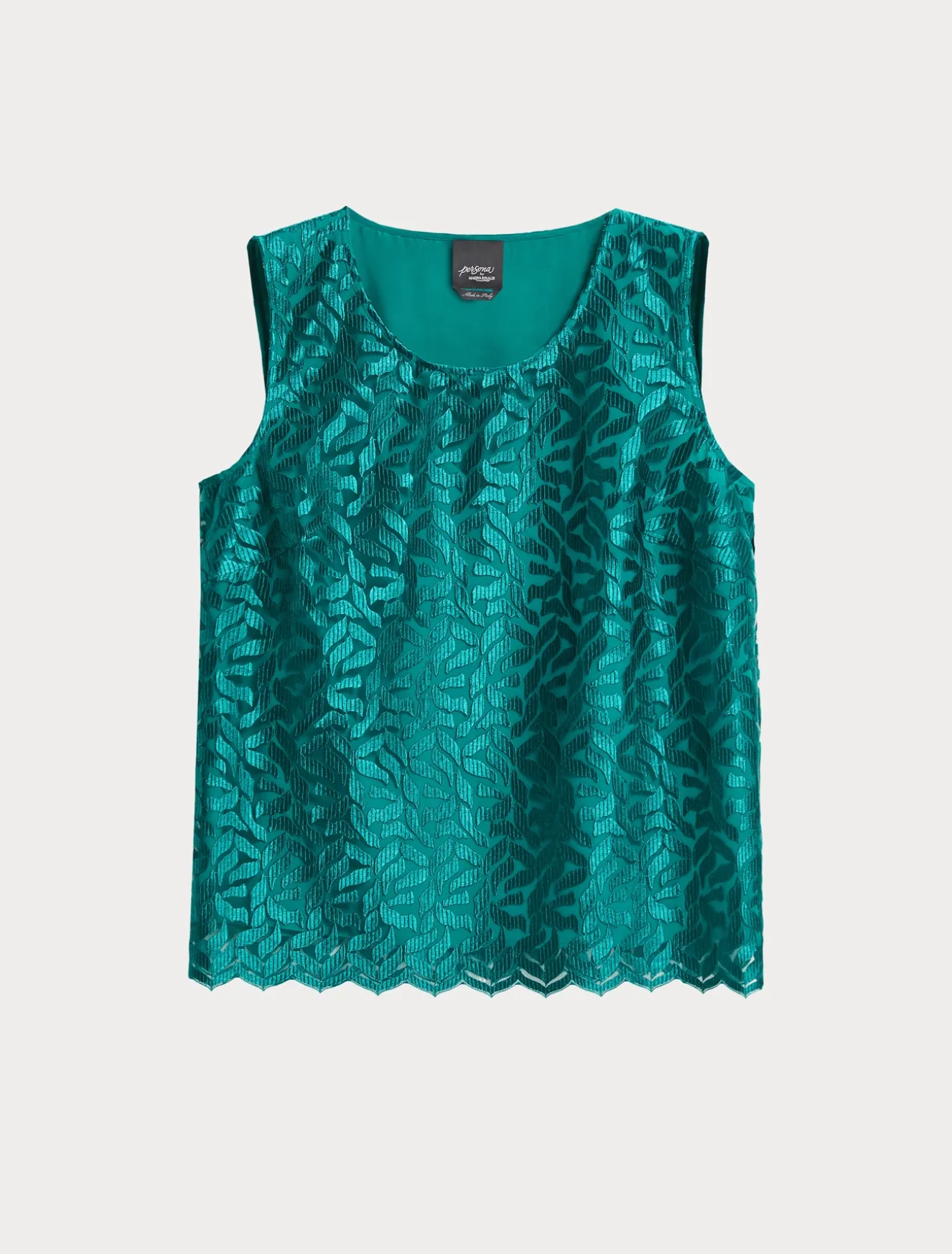 Dettagli romantici per il top in tulle ricamato con disegno a foglia stilizzata. Ha le maniche che possono essere applicate con un semplice intervento di sartoria dedicato. Gli orli smerlati impreziosiscono il capo con un tocco leggero e raffinato. Il capo fa parte della collezione Persona by Marina Rinaldi.