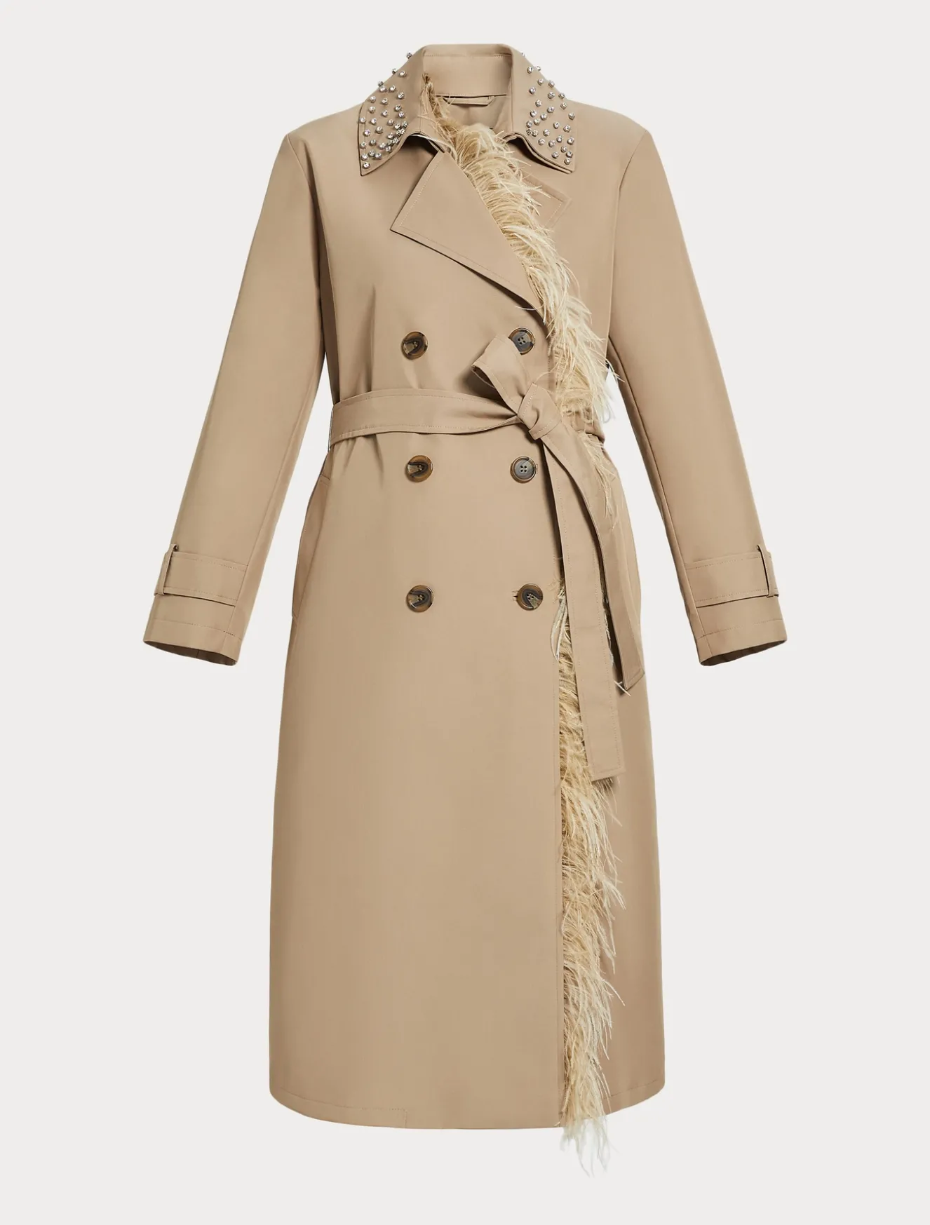 Accessoria questo trench come preferisci grazie al colletto ricamato staccabile e alla passamaneria di piume rimovibile lungo l’apertura. Cintura in vita in coordinato.Il capo fa parte della main collection Marina Rinaldi.